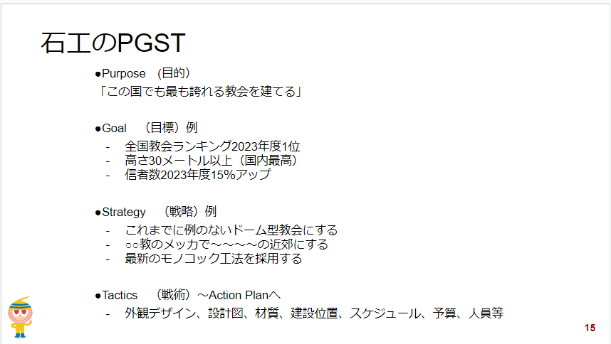 これは、同じ仕事をしている3人でも異なる目的やビジョンを持っているということ。では、石工(レンガ職人)が誇れる教会を建てることを目的としたとき、目標・戦略・戦術はどうなるか…?