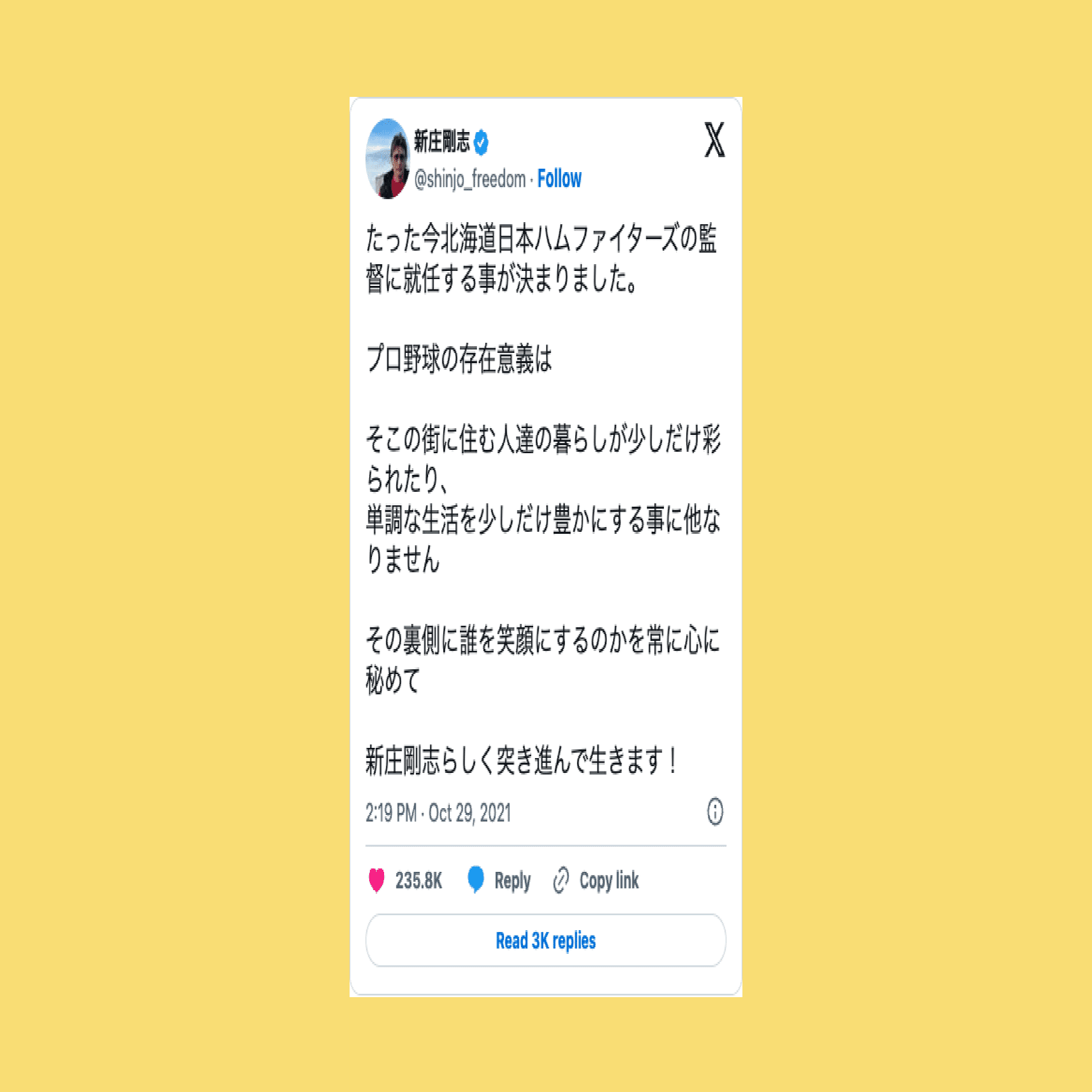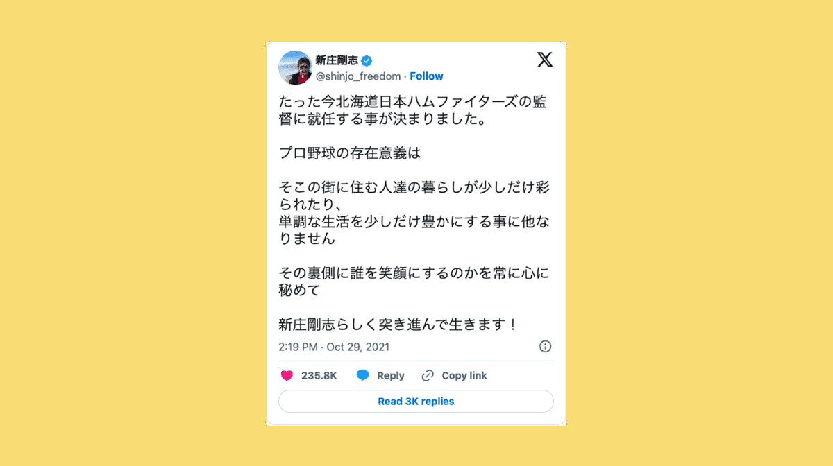 これまた野球の話になっちゃうんですけど、4年前に新庄剛志さんが北海道日本ハムファイターズの監督に就任するときに、こんな投稿をしていたんです。
