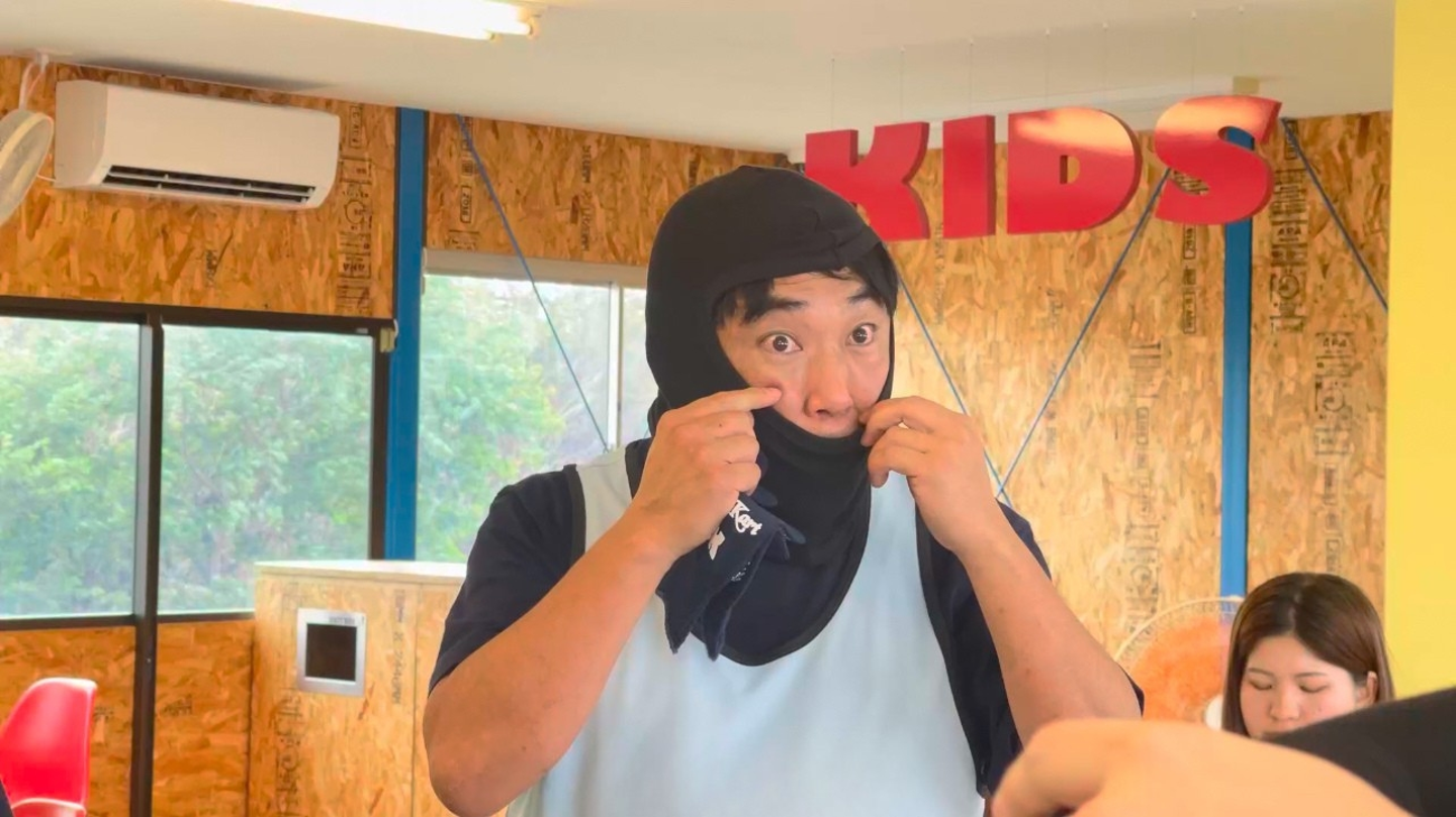 「これであってる〜?」と、ヘルメットの中のヘッドカバーを付けるリーダー