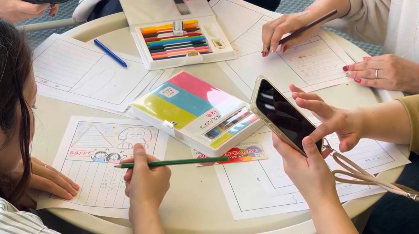 集合後、まずはそれぞれの「未来日記」を作成。共創/戦略プランニングチームが支援している企業でもあるサクラクレパスのクーピーペンシルを使い、メンバーひとりひとりが将来の一コマを想像した未来日記を描いていました。
