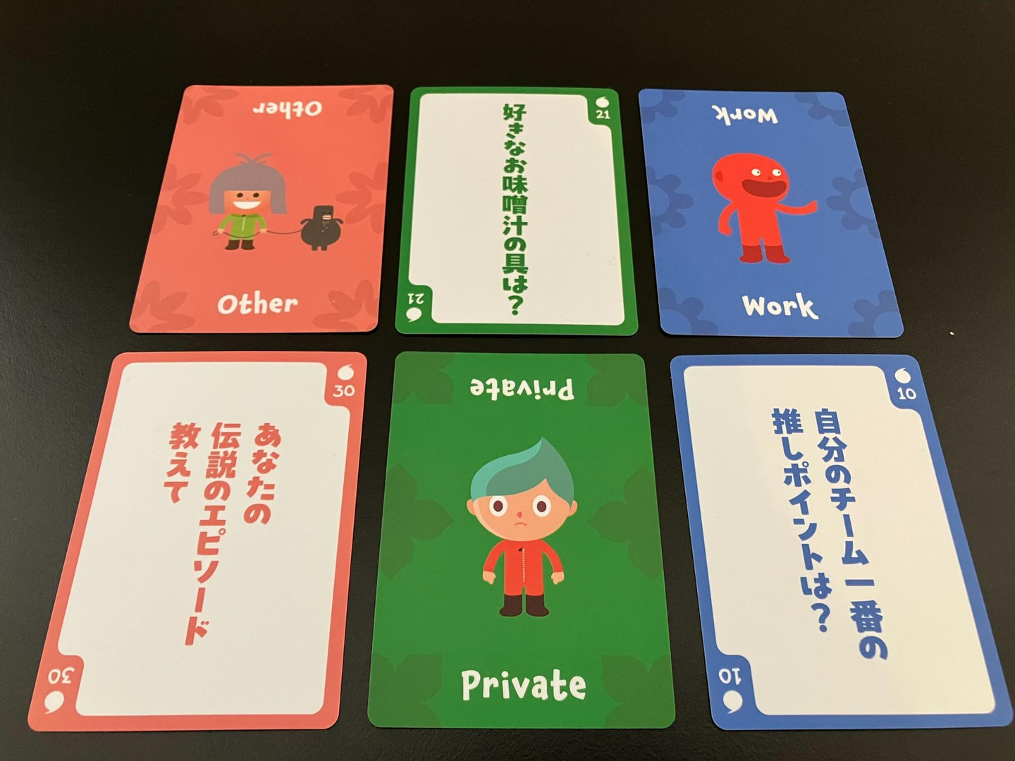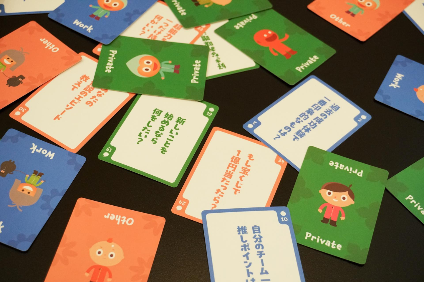 仕事にまつわるちょっと真面目な話から、ちょっとした日常の会話、そしてちょっとユニークなお題までさまざま!テーマを選んで遊ぶのもよし、ランダムにごちゃまぜで引いて意外な話題で盛り上がるのもよし。使い方は自由自在です。