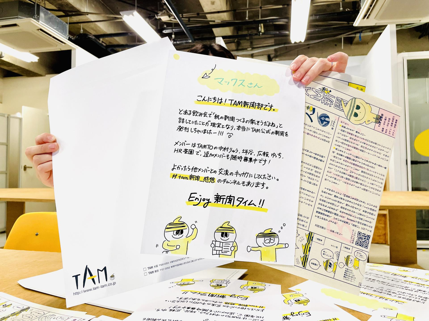 TAM新聞部は、社内向けに“ゆる〜く”発行されている、いわゆる社内報。メンバーへのインタビュー、4コマ漫画、新メンバー紹介や最近のHOTトピックなど、毎号にぎやかな紙面を、協力しながら楽しく作っています。