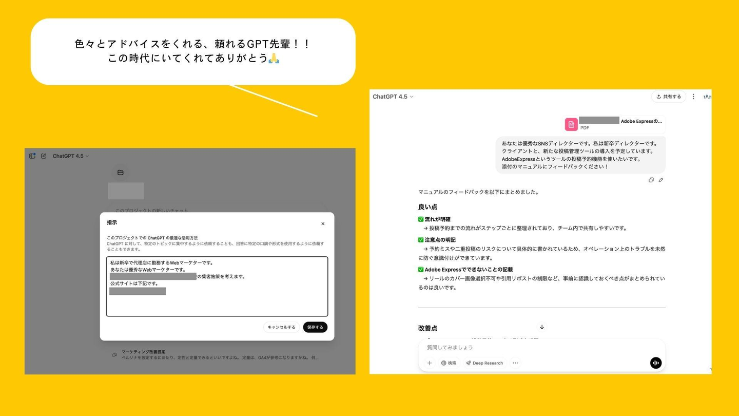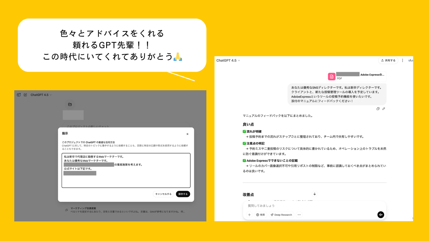 よく使うのは、「あなたはSNSのベテランディレクターです。私は新卒入社のSNSディレクターです。この文章のフィードバックをください」と依頼します。
