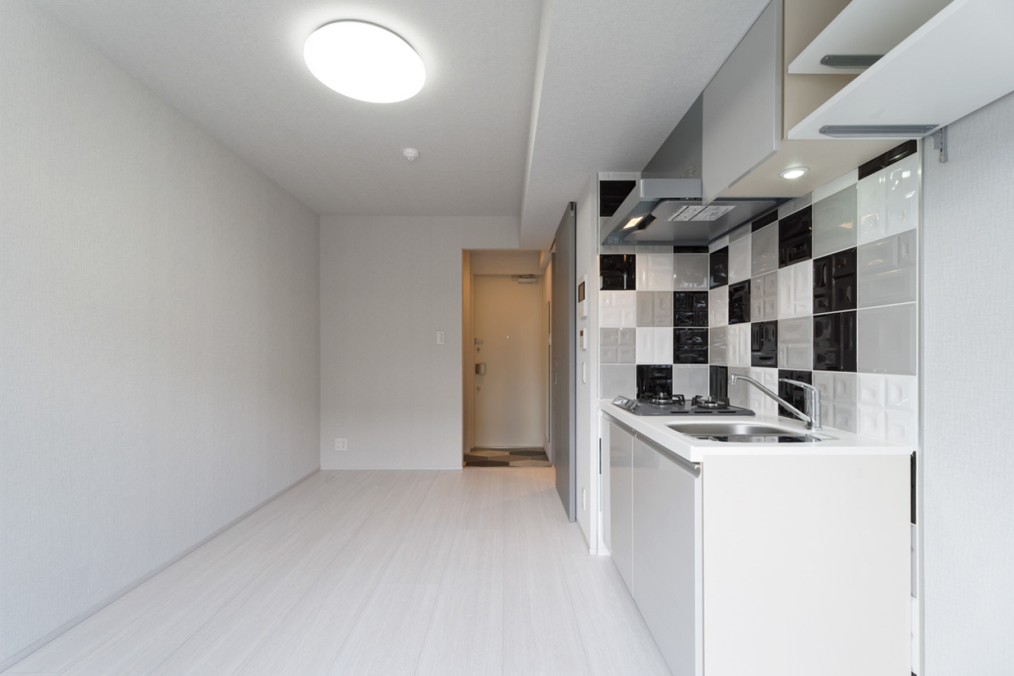 ホワイトを基調としていますが、キッチンのタイルがアクセントでおしゃれ!DIYしにくい賃貸マンションにこういったデザインかなりテンション上がりますよね・・♡