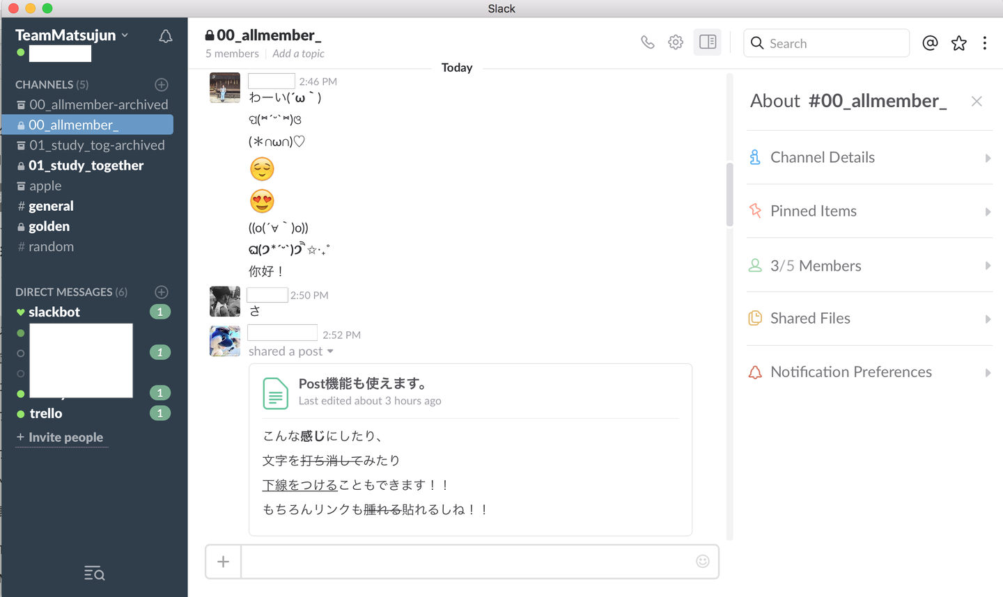 Slackに登録するところからスタートしました。チームに参加し、チャンネルを作成し、Post機能を試し、絵文字で遊ぶという一連の流れです。