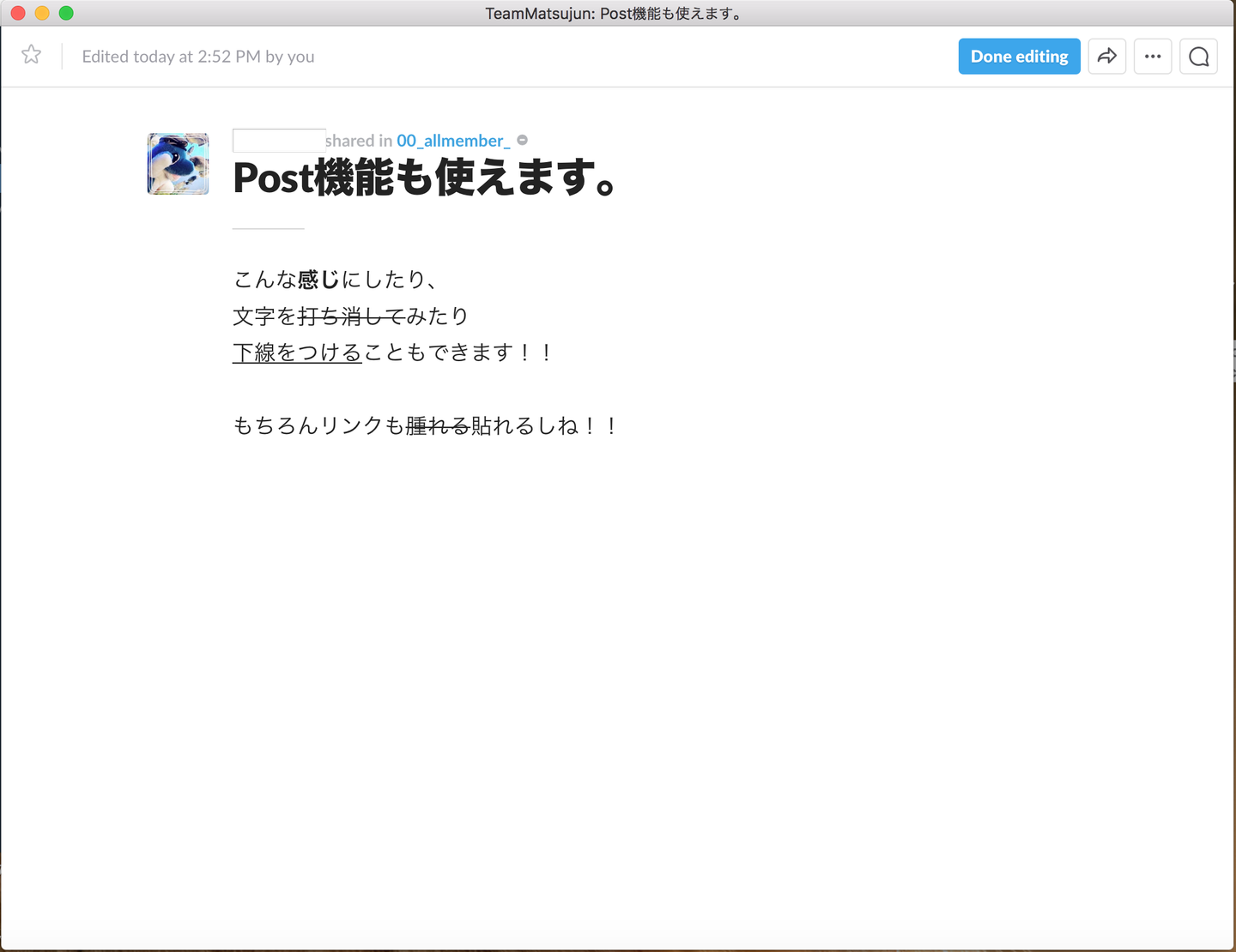 Slackは原則チャットツールなので、内容はどんどん流れていってしまいます。そこで、post機能を使うと便利なのです。