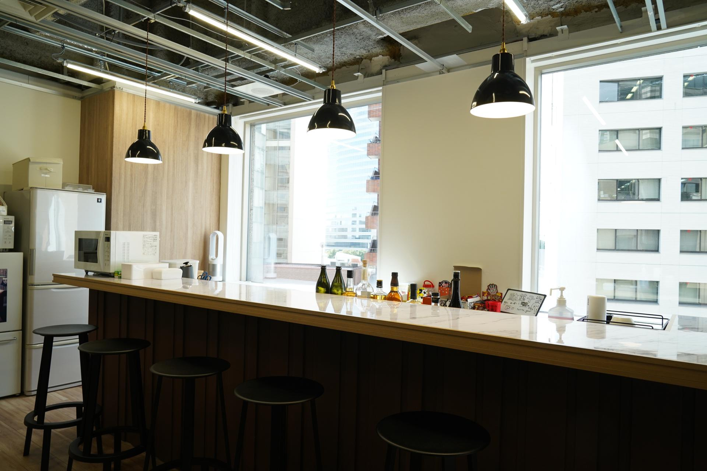 座席は事業部ごとに分かれており、フロア内にはバーカウンターやファミレス席もあります。ファミレス席というのは「一緒にランチを食べられるスペース」ですね。仕事が終わればアルコールも解禁です!旧オフィスにはなかった場所もでき、自然と会話が弾む環境になっています。