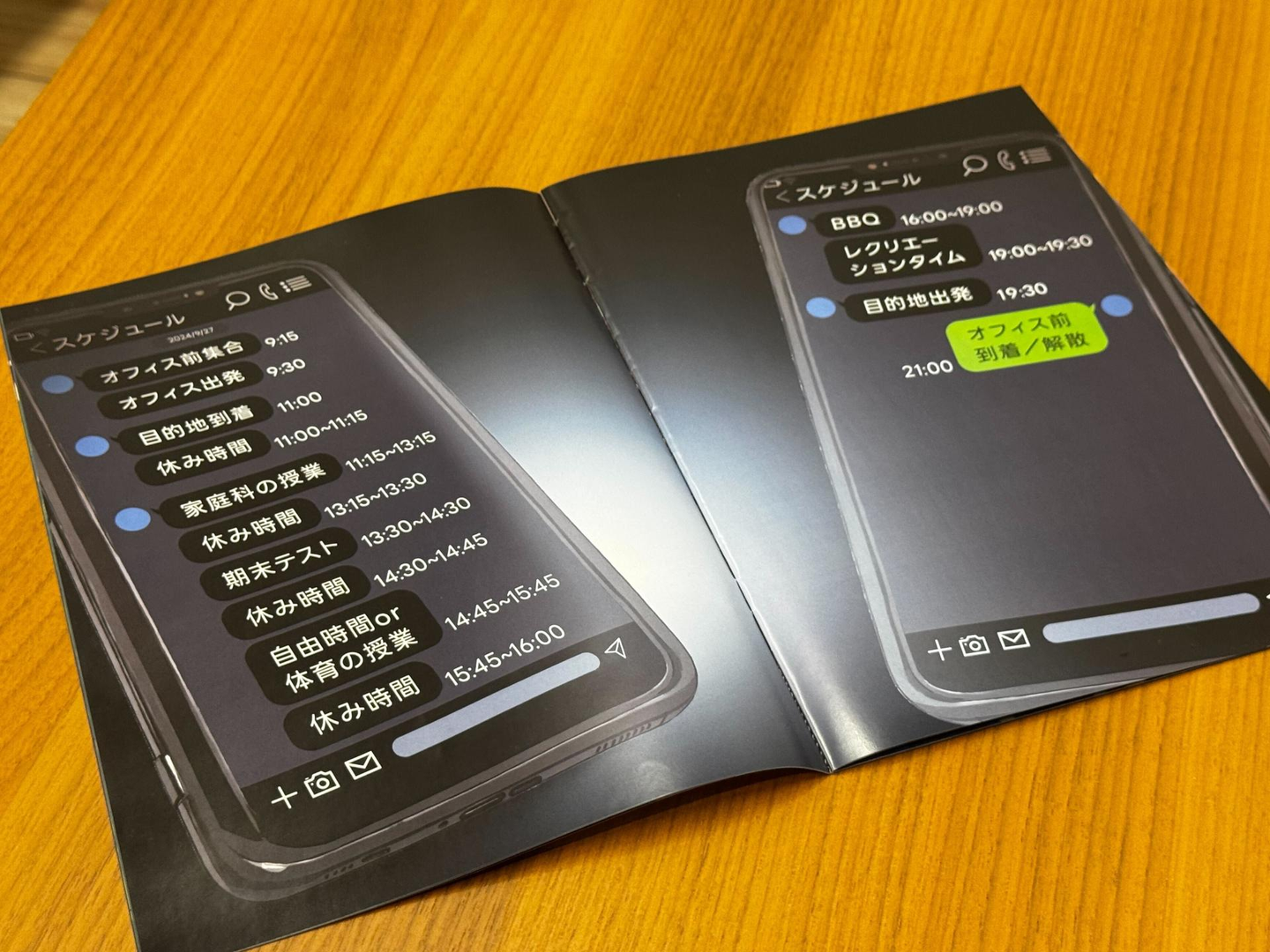 ミステリーツアー2回目も、社員には何も知らせずに経営陣と管理部だけで準備。設立10周年記念として実施しました。「林間学校」をテーマに選び、デザイナーが力を入れて作成した「旅のしおり」も用意。一日のスケジュールは、自社アプリpeep掲載のチャットノベルを模して表現しています。また、役員を「先生」に見立て、メンバーの入社日・名前も名簿にデザインしました。