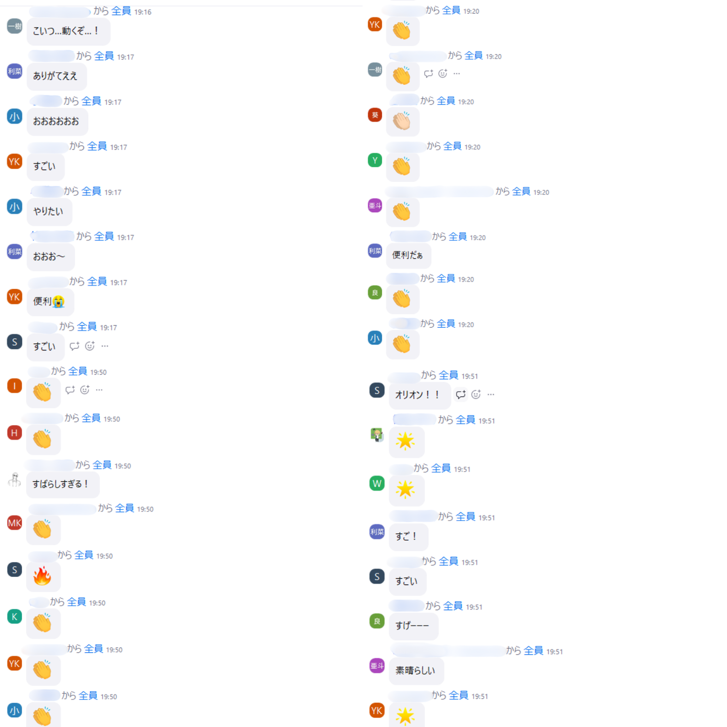 taskeyでは、高い目標を掲げているからこそ、その成果をしっかり祝い、みんなで称賛し合いながら鼓舞することを大切にしています。人数が増えてきたことでオンライン開催になっていますが、全員がカメラをオンにして参加し、チャットの量も圧倒的に多いのが特徴です。大量のコメントやスタンプが飛び交っていますね(笑)
