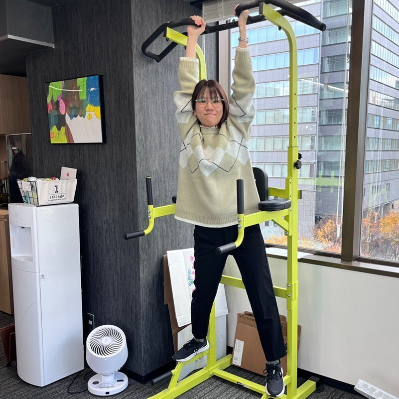 こちらは、カメラを向けるとぶら下がってくれた金子さん。タスキー社員のことをくすっと笑わせてくれる存在です(笑)