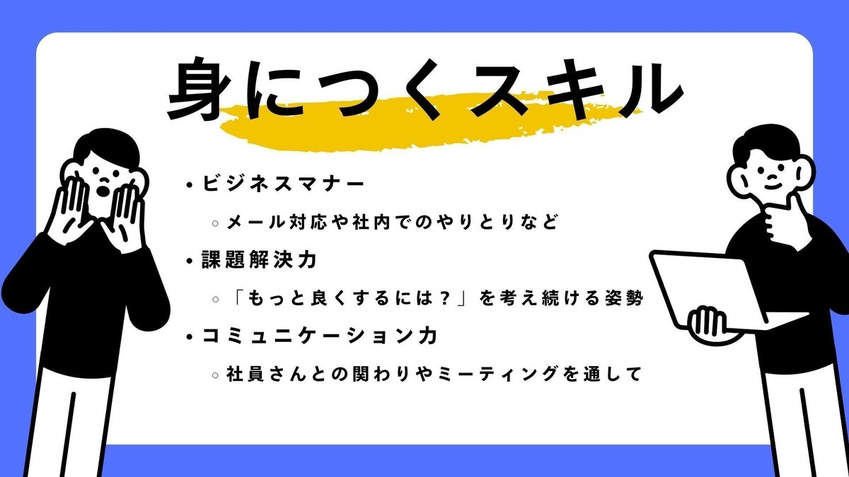 普通のアルバイトでは、「言われたことをこなす」ことが中心になりがちですが、インターンでは「自分で考え、提案し、動く」力が求められます。だからこそ、社会人0年目に必要な基礎的なビジネススキルが自然と身についていきます。