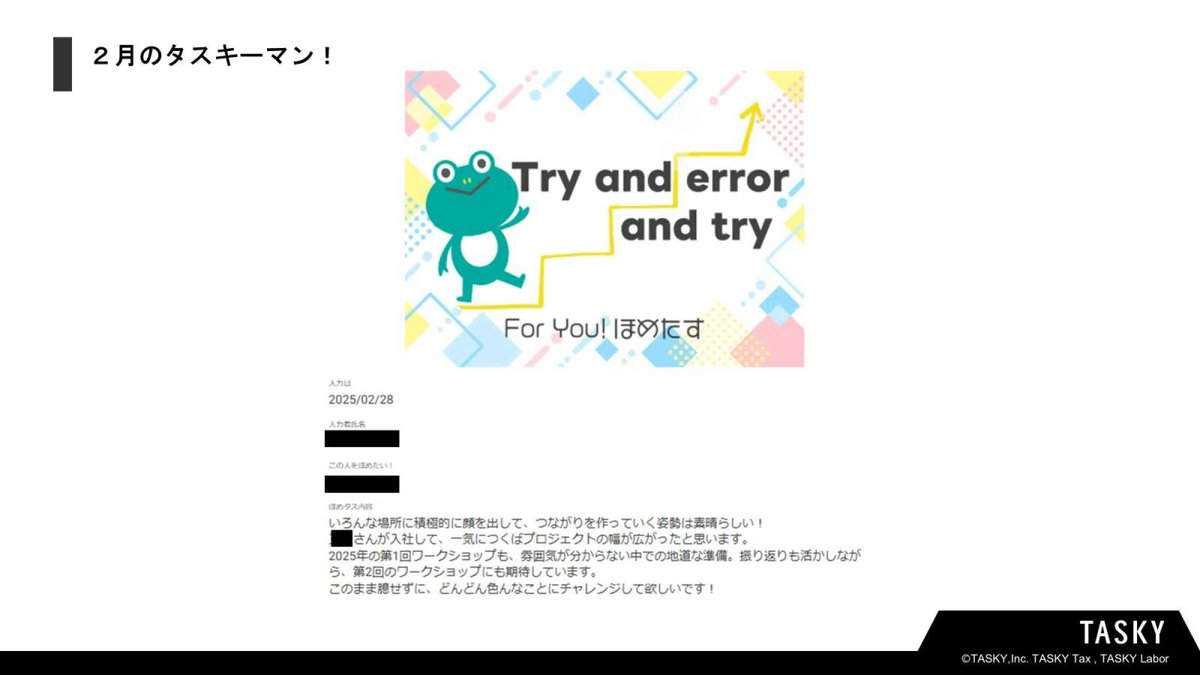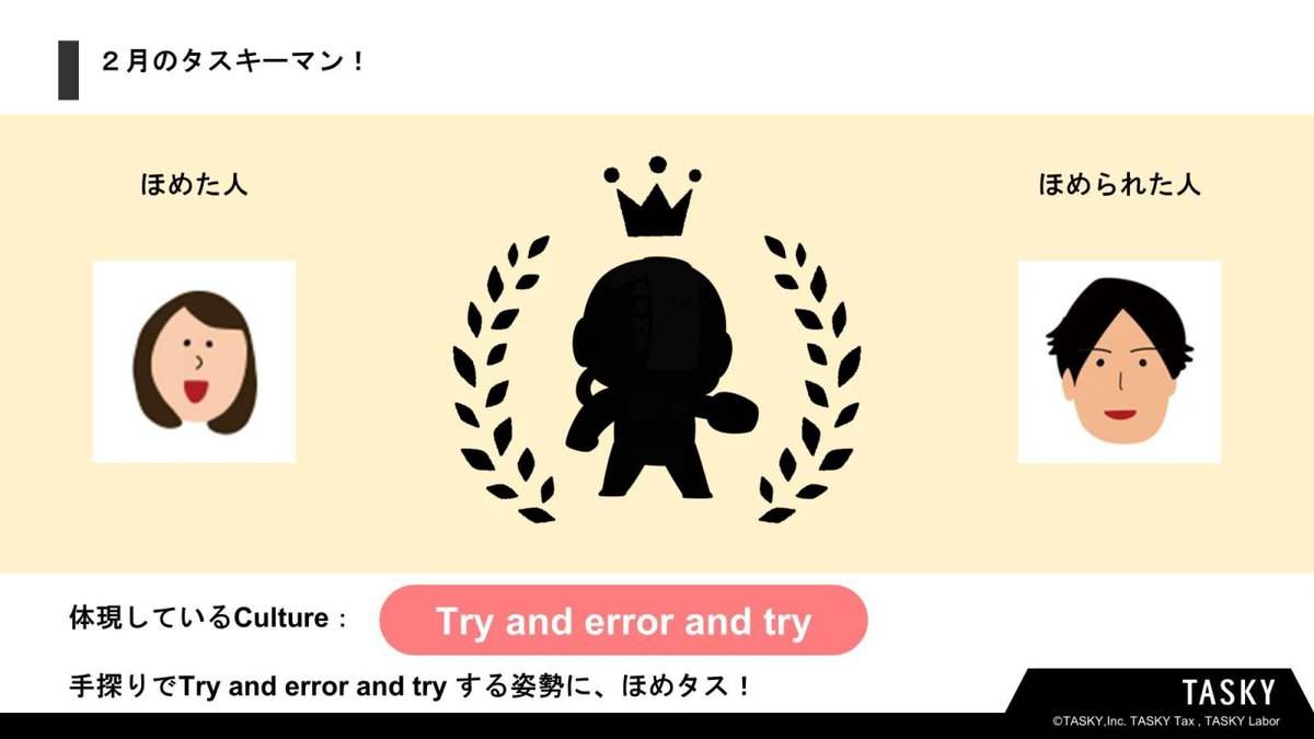 また1月からは、社内のピアボーナス制度「ほめタス」で新Cultureに基づく行動を投稿してもらい、そのうち最もCultureを体現している行動を、毎月の社内全体会議(MJ会議)で「今月のタスキーマン」として表彰をする取組をおこなっています