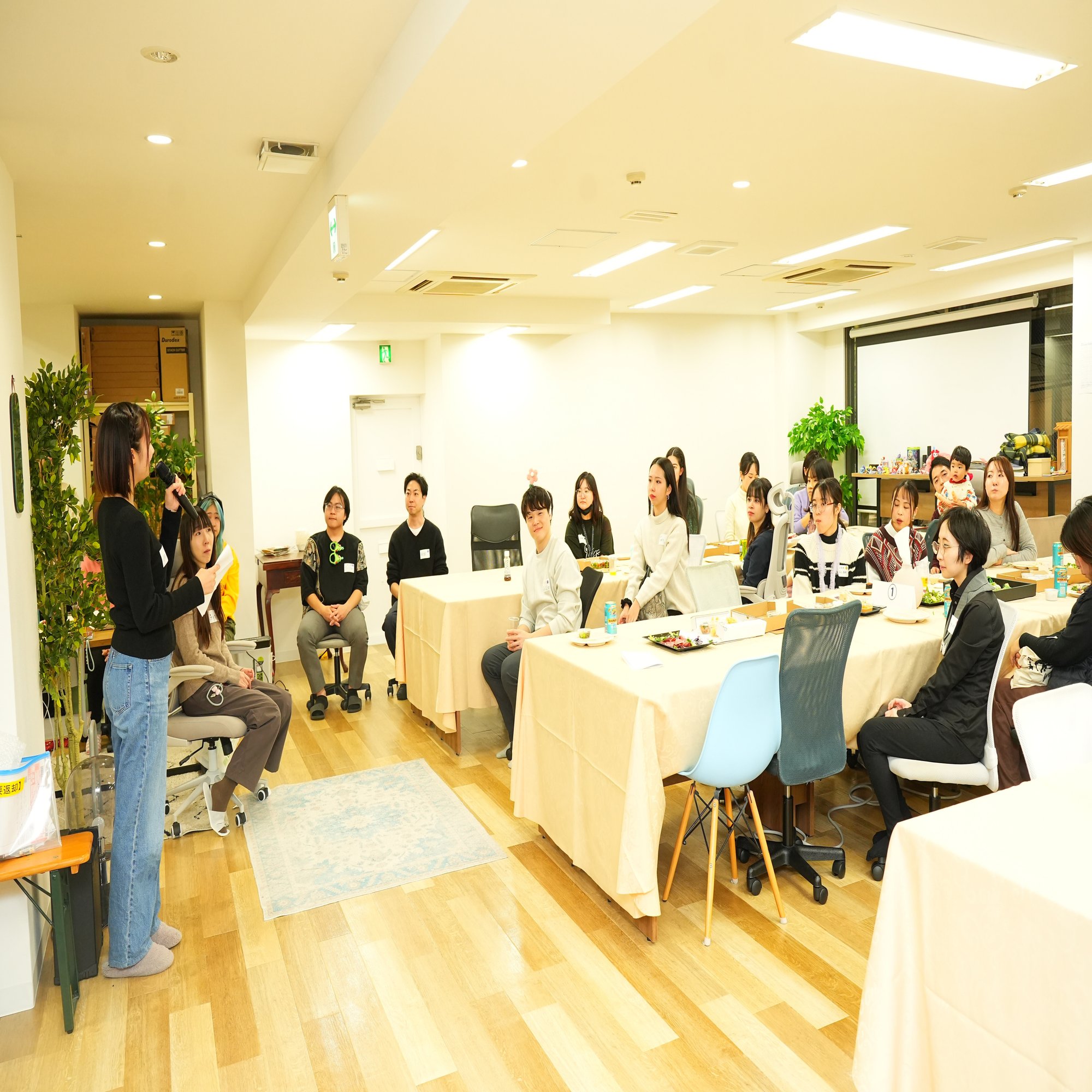 普段は別々の部署で働いているメンバーや、春に入社を控えた内定者の皆さん、普段オンライン上でしか関われないアルバイトの先生が、垣根を越えてフラットに交流できるのがこの会の醍醐味。