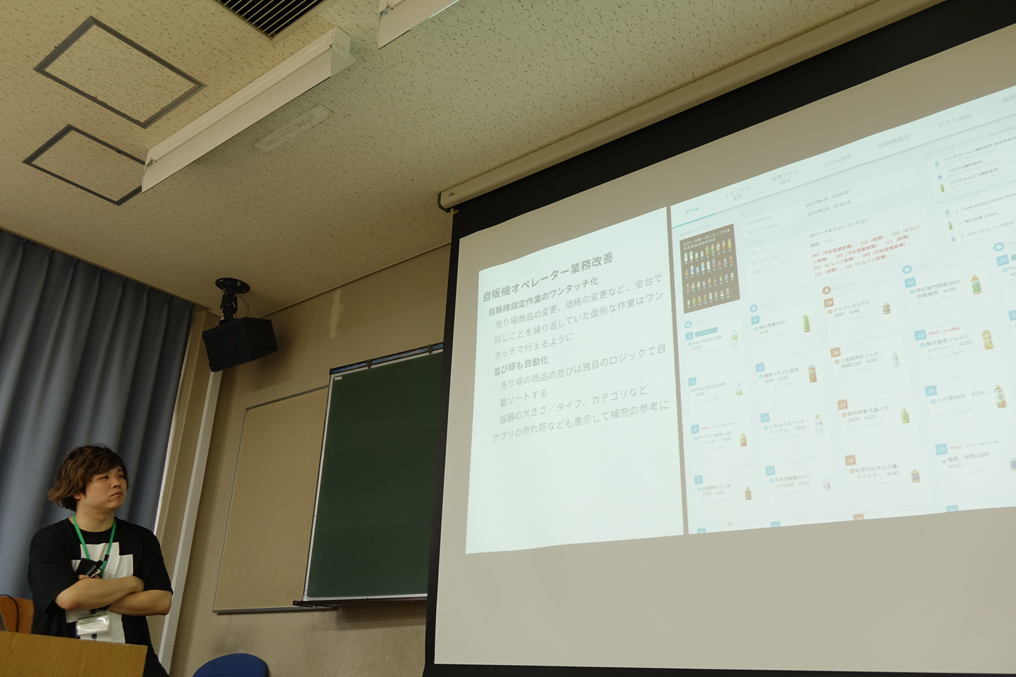テクノロジーショーケース(企業発表)では、弊社カタリストの西村より「Web技術を用いて自動販売機を進化させる」というタイトルで、JR東日本ウォータービジネス様と共同開発したイノベーション自販機についての事例紹介を行いました。
