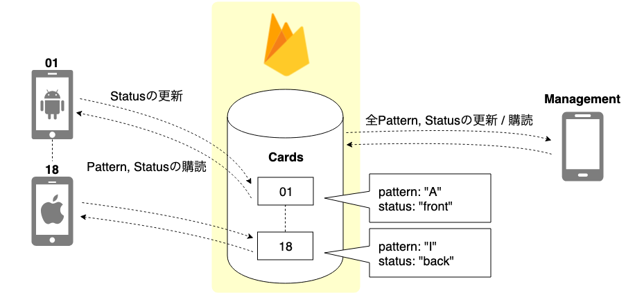 カード用18台と運用1台で最低でも19台の端末でカード状態の更新/購読の通信が必要になります。接続数や設置方法の点からBluetoothや有線での接続だと難しく。会場にWiFiも用意されており、かつサーバの管理が必要ないFirebase Firestoreを採用しました。