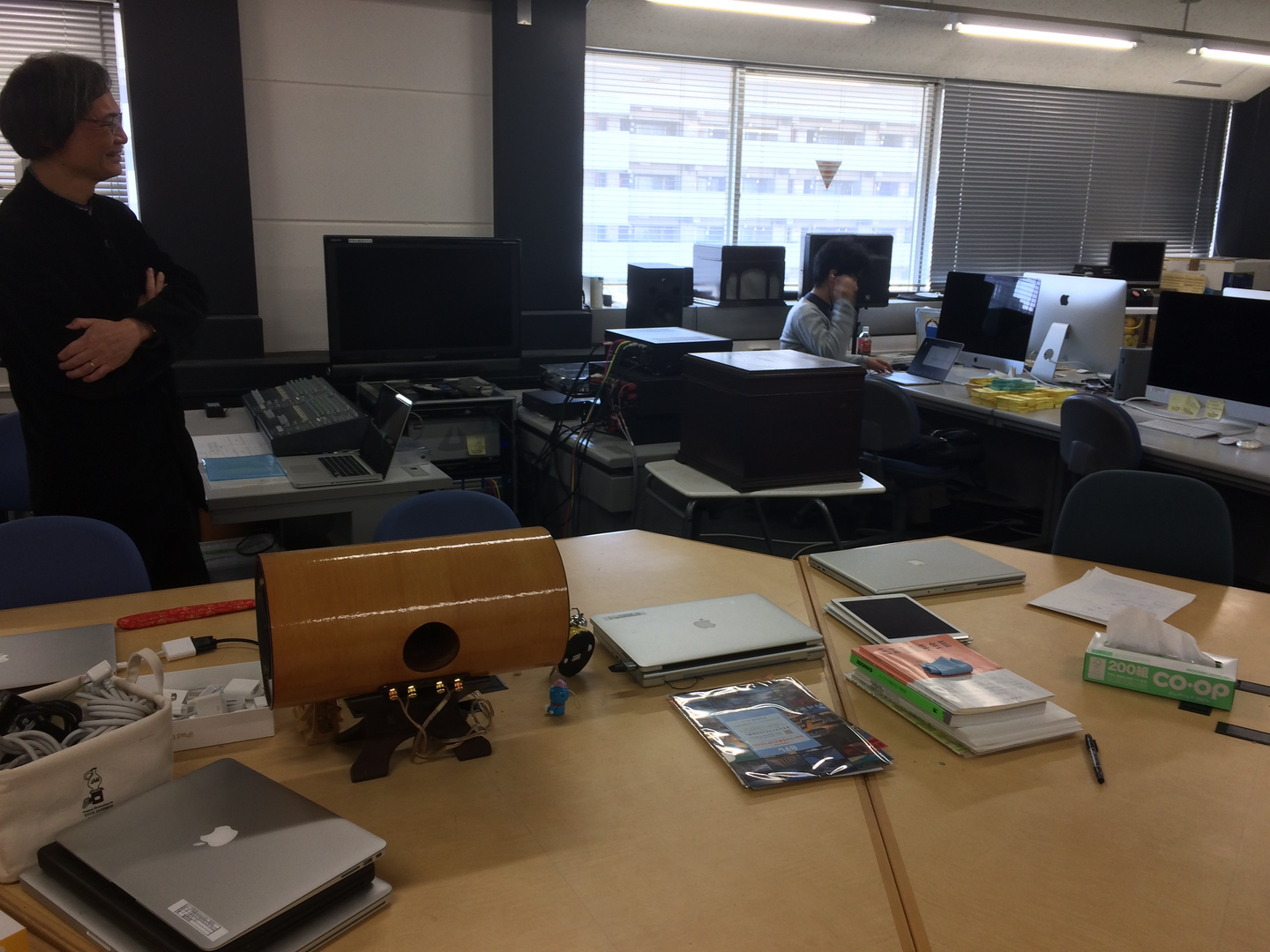 次に学生さんたちの居室に移動したのですが、部屋の色々なところに大小のスピーカー、指向性スピーカー、その他の音響機材が並んでいました。たくさんのスピーカーから上記の明珍火鉢や水琴窟の音など心地よい音を再生し、その空間を自分で移動することで聴きたい音を楽しめるというデモなどを体験し、ゆったりした雰囲気の中で研究についてご紹介いただきました。