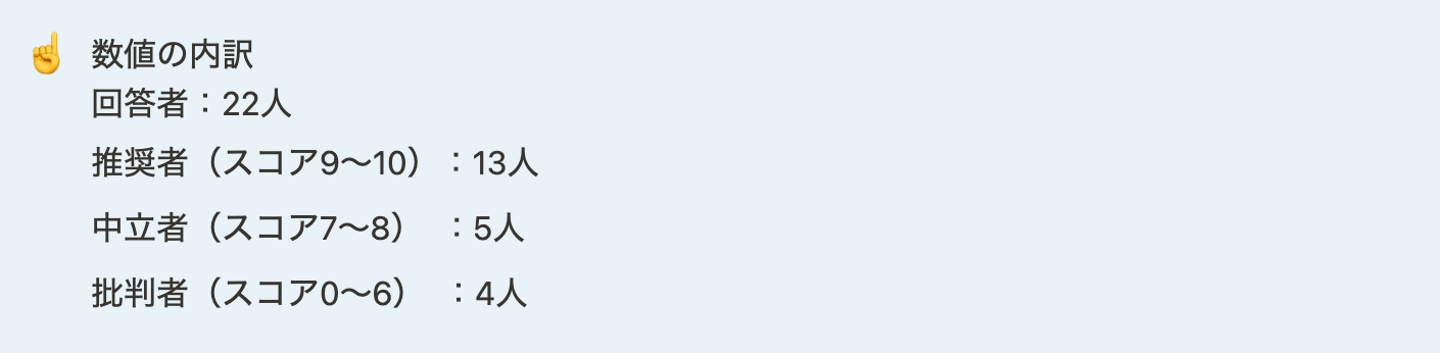 回答者のスコアを、9~10を推奨者、7~8を中立者、0~6を批判者と分け、推奨者の割合から批判者の割合を引いた分をeNPSの数値として結果を算出しました。