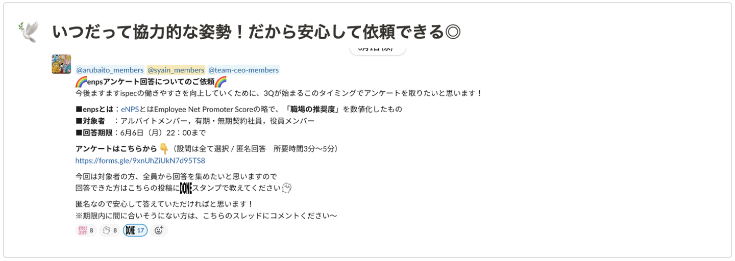 Slackでアンケートを展開するやいなや続々と回答が集まり、あっという間に回答とスタンプが集まりました。これはどの社内でもある、よくあるワンシーンかもしれませんが、ほんのちょっとしたことでも手を止め、小まめに協力してくれるメンバーがいることは、当たり前じゃないなと感じます。組織を良くしていきたいという、個々の姿勢が垣間見えました。