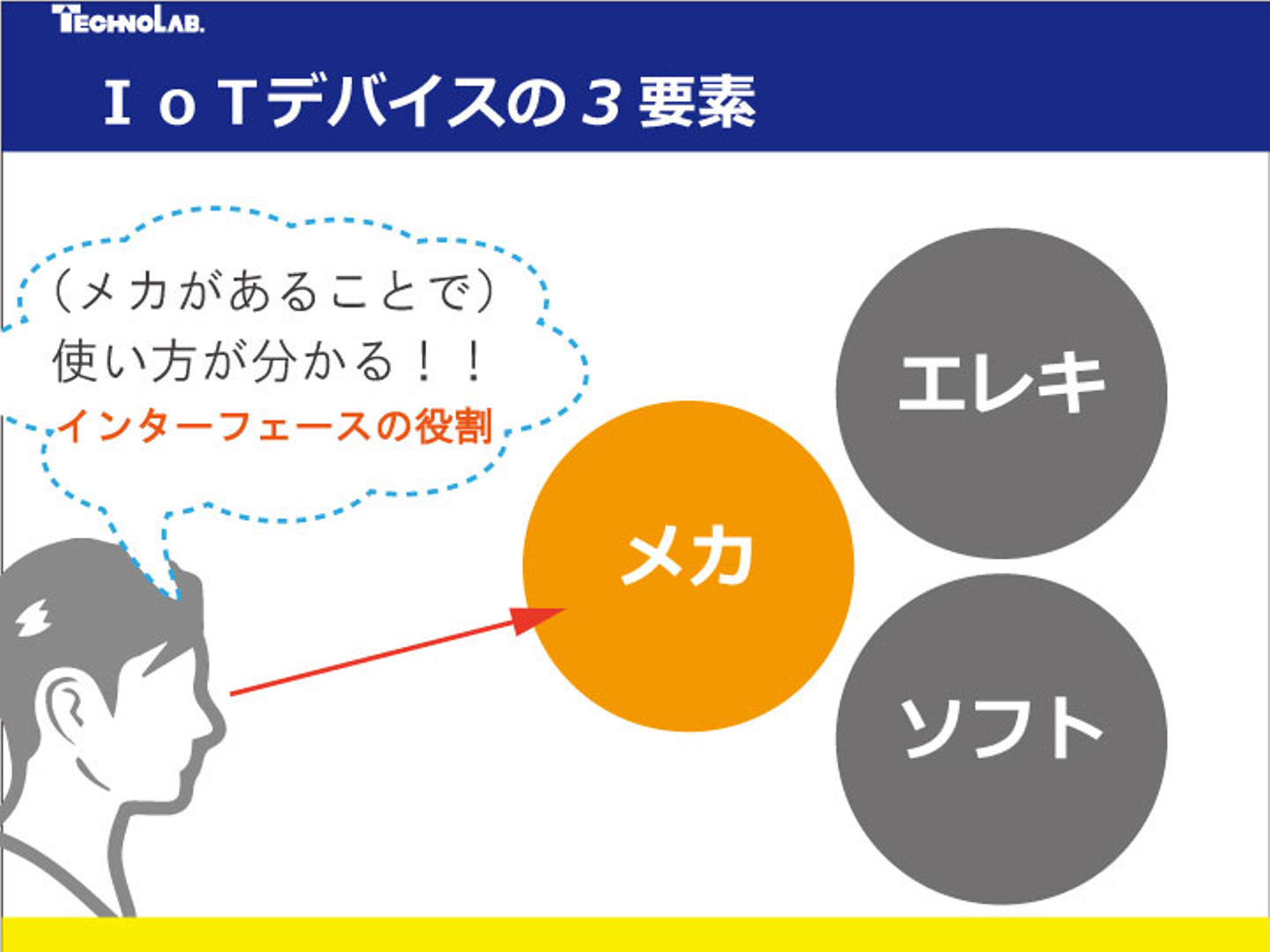 IoTデバイスには『エレキ(基板)』『ソフト(アプリ)』『メカ(カタチ)』の3つの要素が必要です。重要なのはアプリやソフトだと思われがちですが、新しい技術や概念、使い方には新しいカタチなくして人々の生活に入り込むことは困難です。 技術の進歩が著しい現代、カタチには人の理解を助ける機能もあるからです。エレキやアプリの新しさを知るには、実際に体験するか、体験した人から説明を聞くことが必要ですが、カタチを工夫することで既にある製品との違いや新しさをノンバーバルに、かつ(言葉に比べると)瞬時に伝えることができます。
