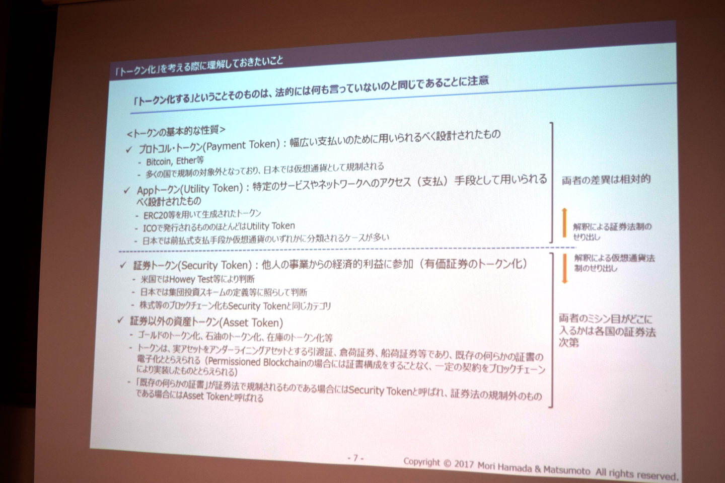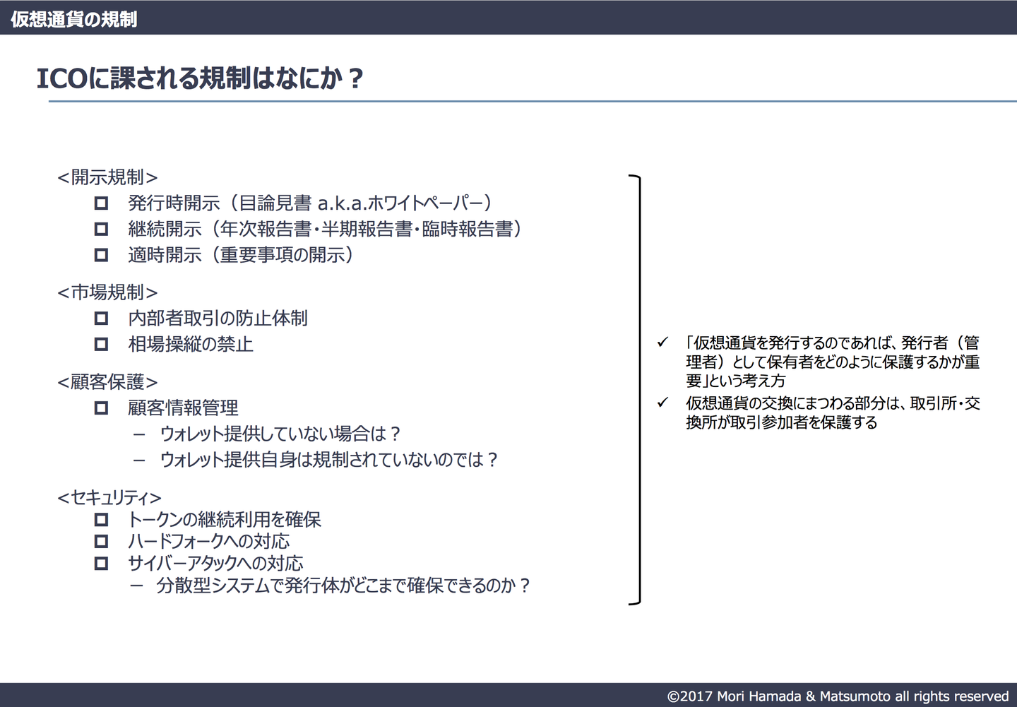 仮想通貨の規制に関する内容では、日本の現状の法規制はまだまだ全体のごく一部しかカバーできておらず、これからである部分がたくさんあるとした一方、何がどの法律に該当するのか、実際に法律の内容をどうしていくのかが不明確な状態ではあるとの課題も指摘しました。