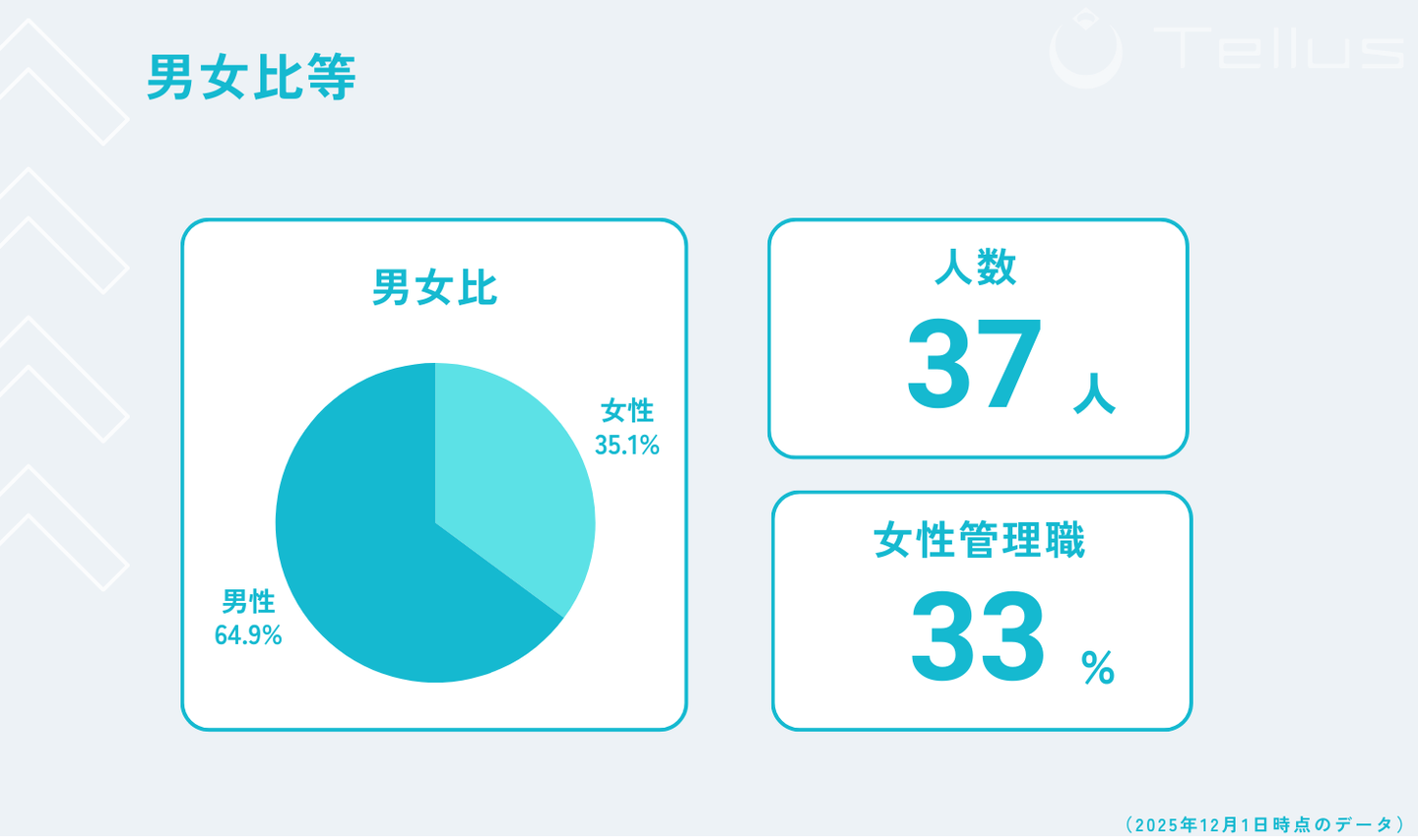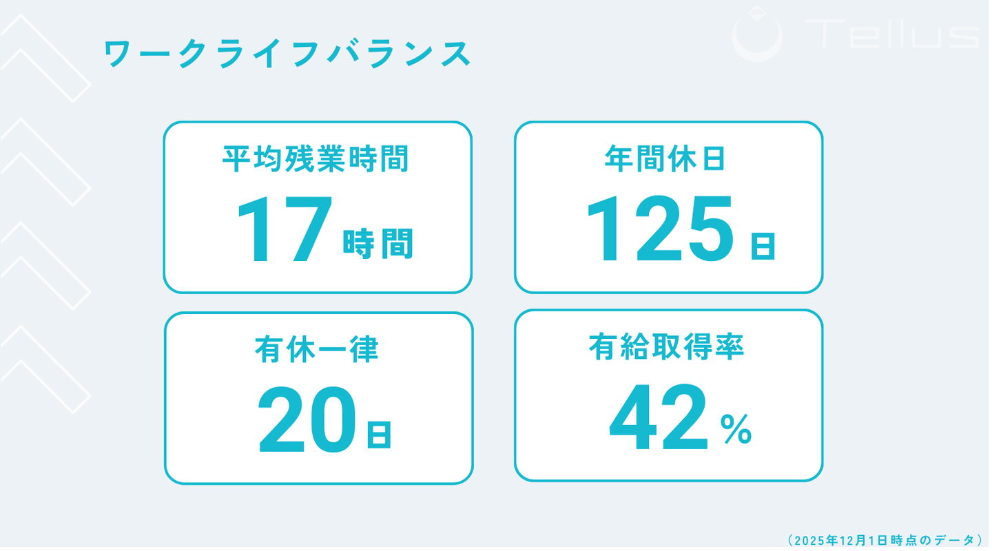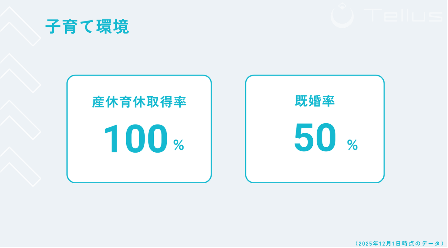 Tellusメンバーの産休育休取得率は100%となっております。(男性社員の育休取得実績有)