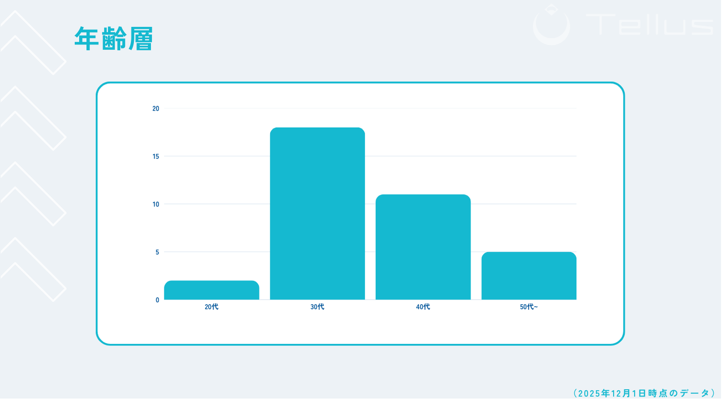 ボリュームゾーンは30代で、約半数が30代になります。ちなみに最年少が25歳、最年長が65歳になります🫡