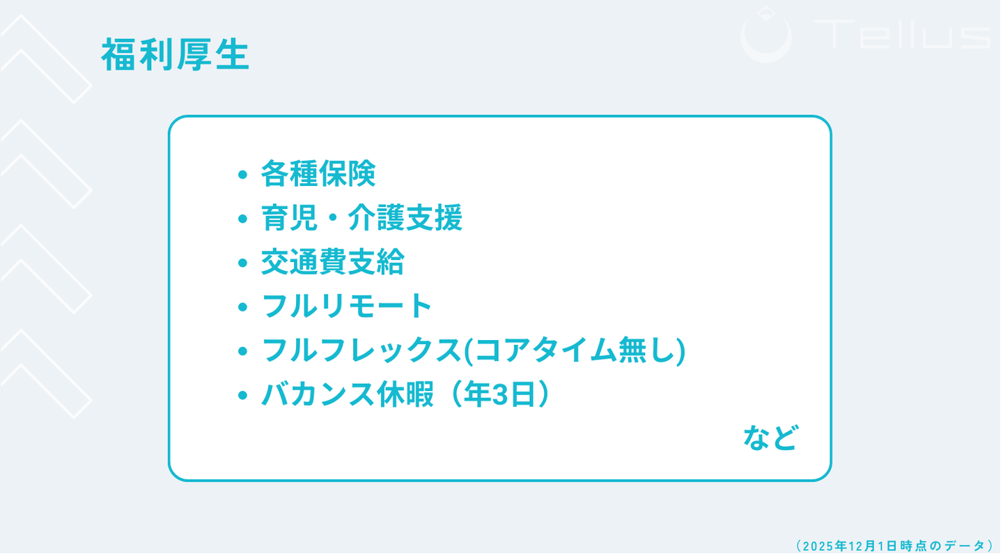 各種保険や育児介護支援等はもちろんのこと、フルリモートフルフレックスの環境が整っています。