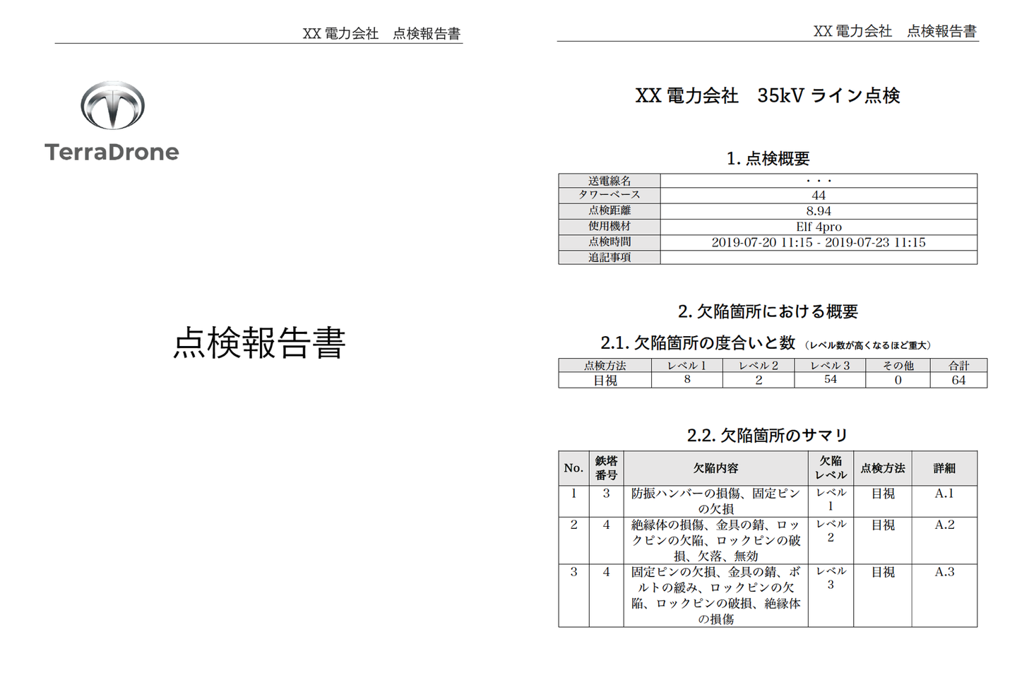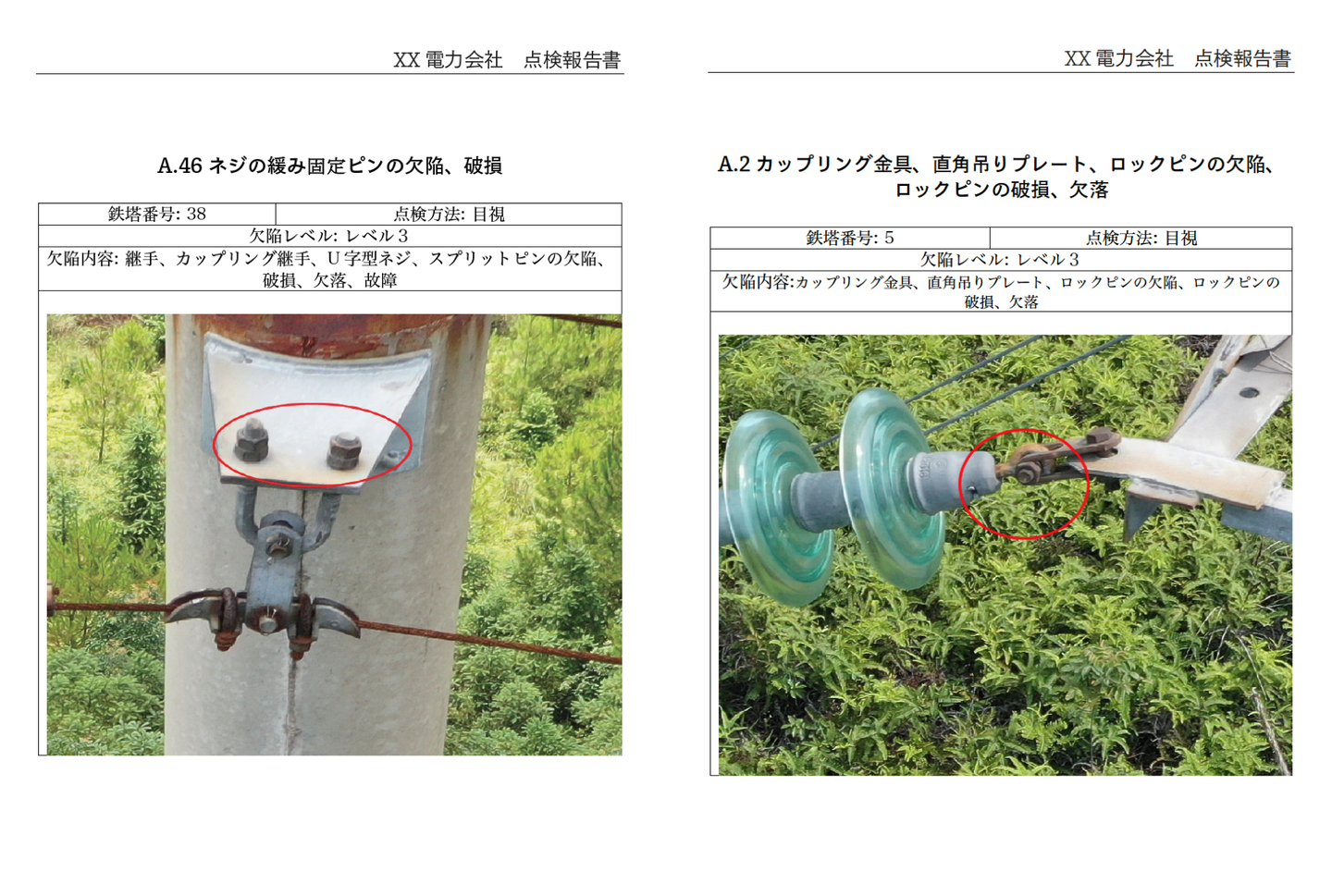 ドローン飛行により取得したデータは、このAIアルゴリズムを活用したシステム上で処理することで、鉄塔部品のゆるみやサビ、ピンの欠損、さらに鳥の巣までも自動で特定することが可能です。さらに、修繕が必要な箇所については自動でレポート生成することもできます。