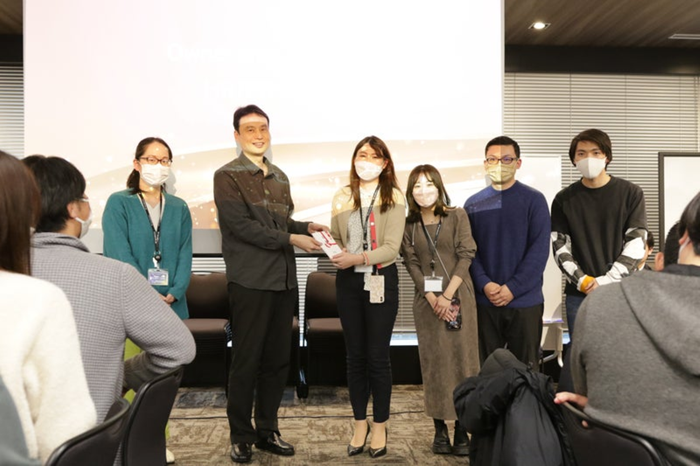 写真の画質や背景から時代を想像したり、スライドに近づき小さい名札の名前を見ようとしていたりする人もいて白熱して盛り上がりました。幼少期でも意外と面影がある人も多く、正解率も高かったです!優勝者にはテラドローンのロゴが入ったタンブラーをプレゼント。