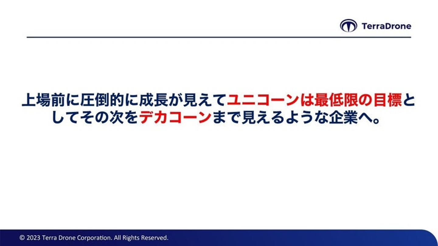 「2022年度は過去最高の売上で、その評価もあり情勢が厳しい中でも資金調達をすることができました。3月には80億円、直近ではサウジアラムコのVC Wa'edから18.5億円。その一方でテラドローンが目指す目標と比較して課題感もまだまだあるので、引き続き成長カーブを描いていきたいと思っています。ユニコーンは当たり前でデカコーンを目指せる会社にしていきます。そのためにも海外チャレンジを引き続き行っていきましょう。」