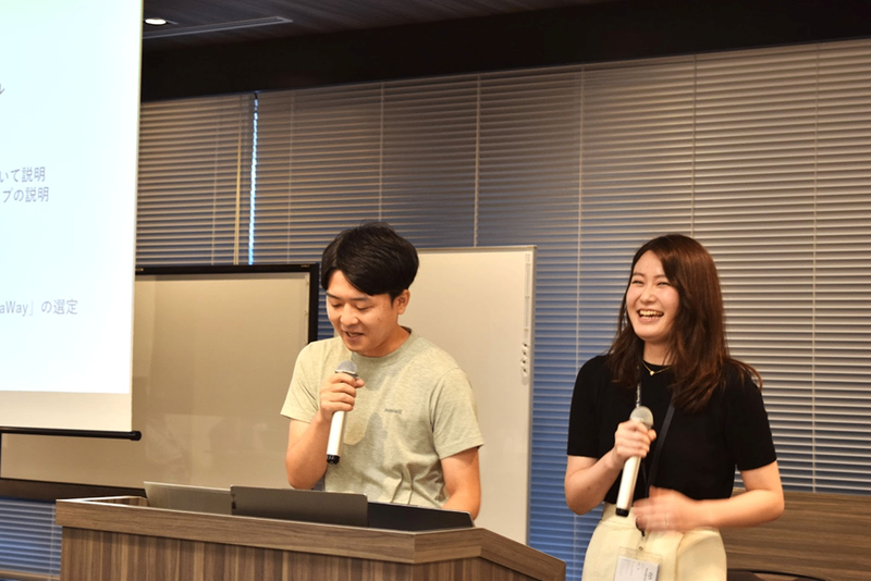 MCはHR/PRマネージャーの宮本さんと、今年入社した宮本さんの前職の同期、青木さんです。同期ネタで場を沸かせつつ、盛り上がりのある司会を展開しました。