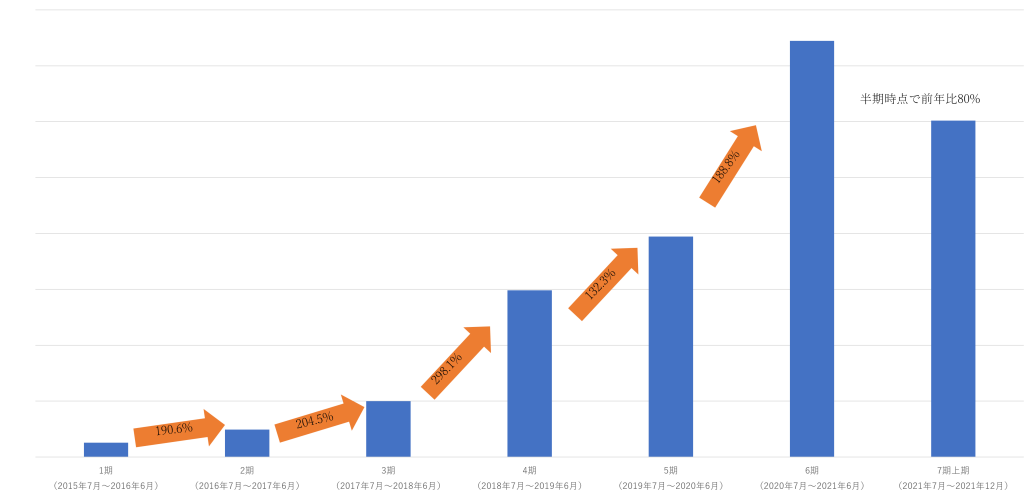 2021年6月~11月の6カ月の売上は、2020年6月~2021年5月の1年間の売上の113%となり、半年間で1年分を超える売上を記録しました。