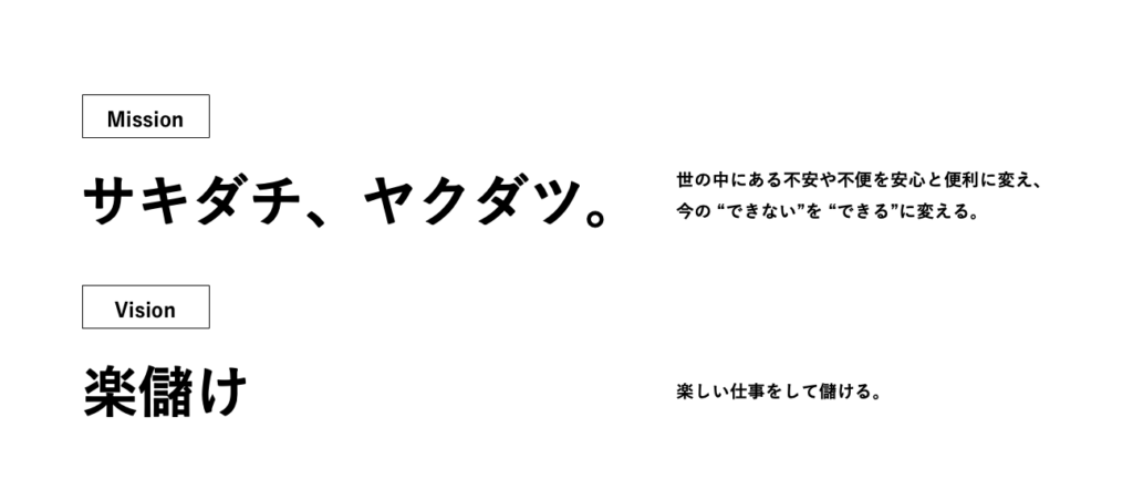 これまでビジョン・ミッションのポジションは、最上位をミッション(サキダチ、ヤクダツ)、その下にビジョン(たのもうけ)と設定していましたが、最終的に「僕らは楽しい仕事で価値を生み出して続けていきたいよね」という話に着地し、最上位をビジョン(たのもうけ)に変更しました。