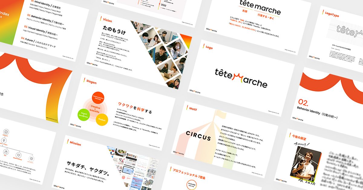 次に、会社のキャラクター(モチーフ)の設定を行いました。これは人格とか個性とかそういう言葉でも言い換えられると思うのですが、僕らは「テテマーチって一言で言うとどんな会社?」という問いを立て、テテマーチというキャラクターを明確化していきました。