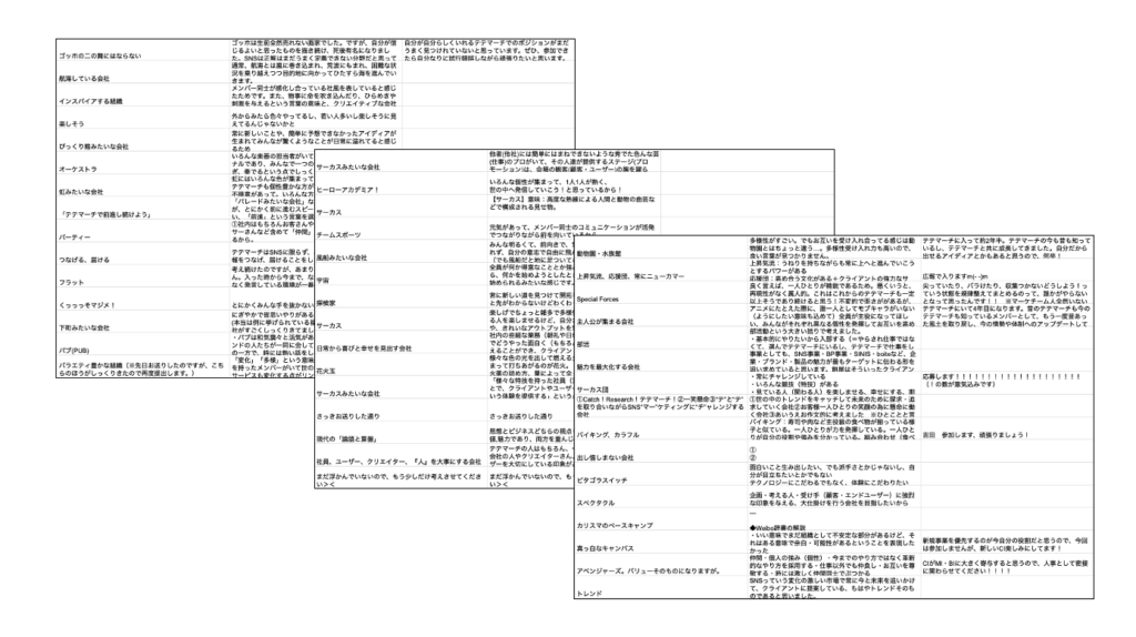 創業以来2-30名のメンバーでしたが、ここ数年の急激な企業成長に伴いテテマーチに入社する人の毛色が変わってきました。これは組織が大きくなるタイミングなので、もちろん必要な要素ではあります。ただその中でも、同じ会社のメンバーとして目指す方向性、会社に対するイメージとしてブレを少なくしたいと考えました。