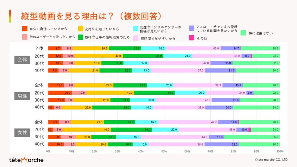 世代別の特徴として、20代男女の1位は41.0%で【短時間で見やすいから】、次いで【流行りを知りたいから】が40.0%となり、他の世代と比較して情報感度が高い世代であることが分かりました。