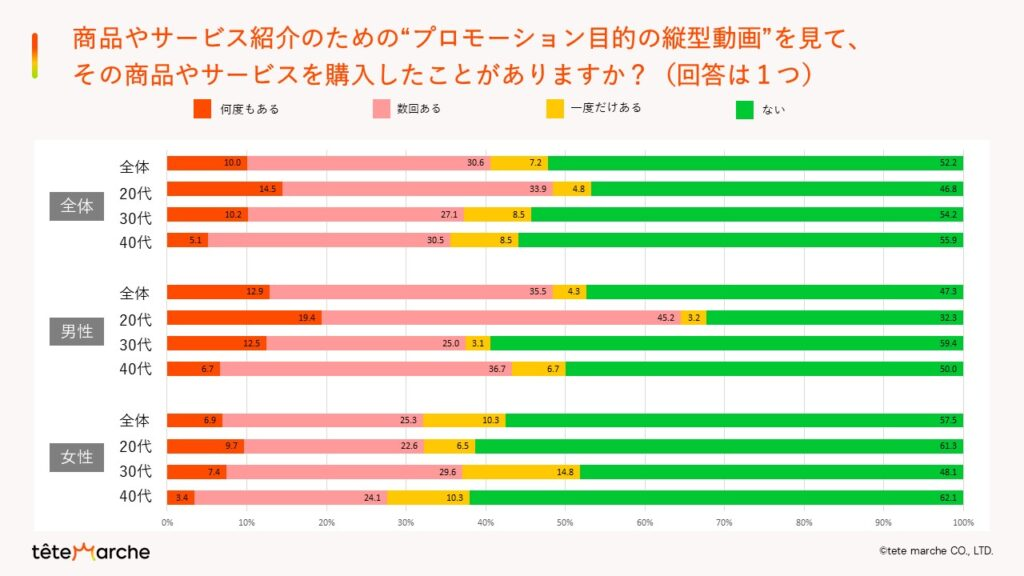 購入したことが【数回ある】が30.6%、【何度もある】が10.0%、【一度だけある】が7.2%となり、47.8%がプロモーション目的の縦型動画を見て購入経験あるという結果になりました。