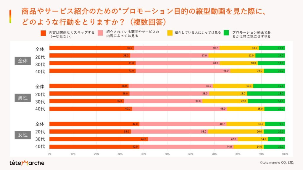 【紹介されている商品やサービスの内容によっては見る】が40.7%。次いで、【内容は関係なくスキップする(一切見ない)】が40.0%、【紹介している人によっては見る】が18.7%、【プロモーション動画であるかは特に気にせず見る】が12.3%という結果になりました。性別・年代別だと30代女性は【内容は関係なくスキップする(一切見ない)】が46%と一番高い結果でしたが、40代男性は【紹介されている商品やサービスの内容によっては見る】が46%と一番高い結果となりました。