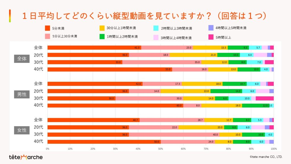 【5分未満】の回答が41.3%で1位、【5分以上30分未満】が23.0%で2位、【30分以上1時間未満】が15.3%で3位という結果になりました。また、【1時間以上】を選択した結果を合わせると20.3%で、特に20代女性と30代男性は【3時間以上】が10%となり、長時間視聴しているユーザーが多く、縦長動画が注目されている結果となりました。