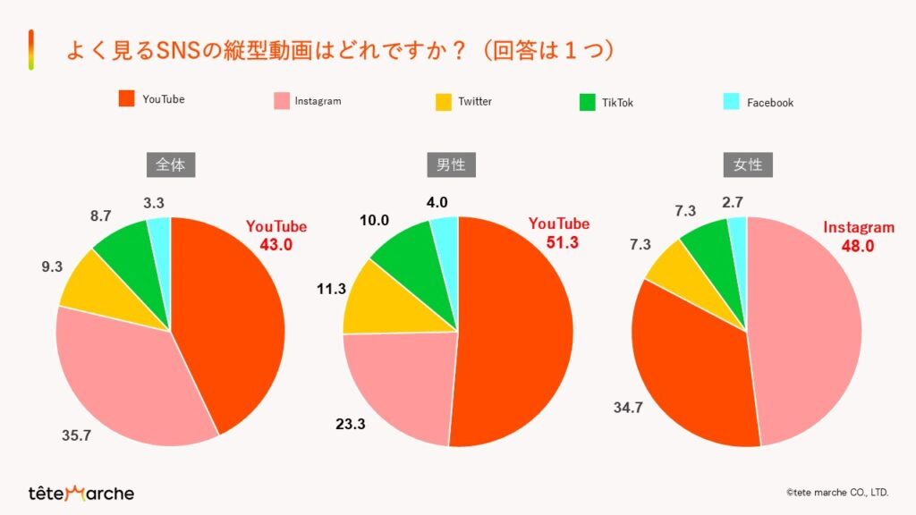 【YouTube(shorts)】が43.0%。次いで【Instagram(Reels)】が35.7%、【Twitter】が9.3%、【TikTok】が8.7%となりました。また、男女で縦型動画を視聴しているSNSに違いがみられ、男性の1位は【YouTube(shorts)】、女性の1位は【Instagram(Reels)】という結果になりました。
