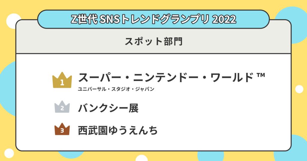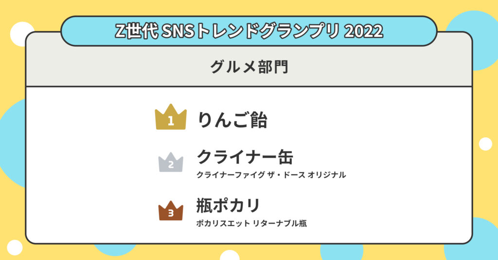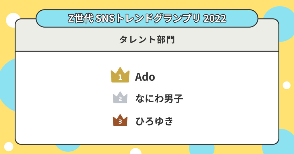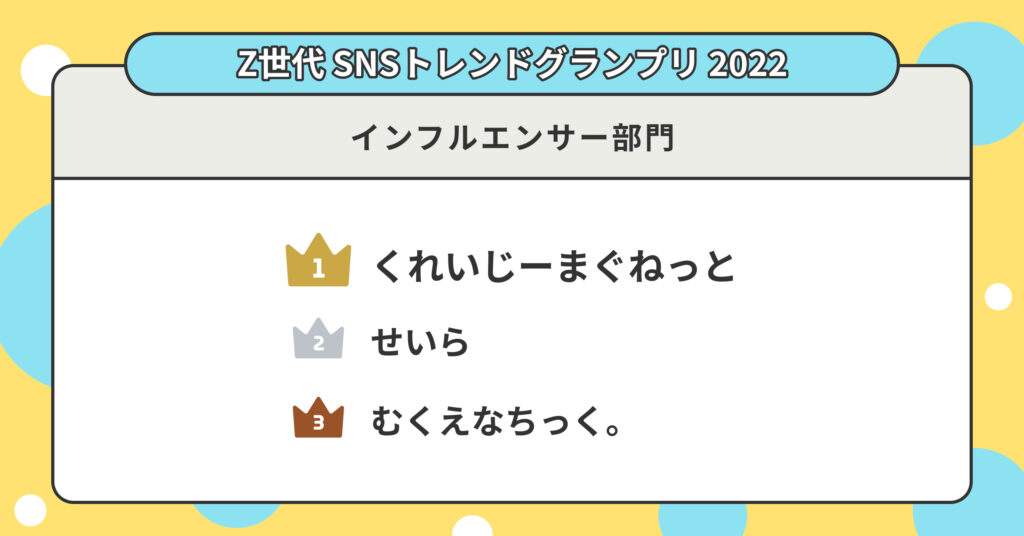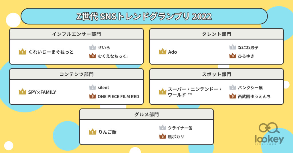 『Z世代SNSトレンドランキング2022』は、19歳~23歳のZ世代388名を対象に今年のSNSのトレンドについて「インフルエンサー部門」「タレント部門」「コンテンツ部門」「スポット部門」「グルメ部門」の5部門に分けてアンケート調査を実施。その結果をランキング化しました。