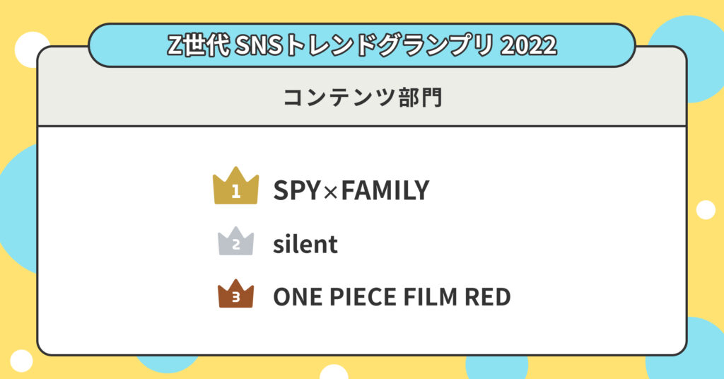 また、コンテンツ部門に関しては、それぞれ話題作である中でも、SPY×FAMILY=キャラクター性・silent=脚本・ONE PIECE FILM RED=歌と、各コンテンツがSNSで話題になるポイントが異なりました。