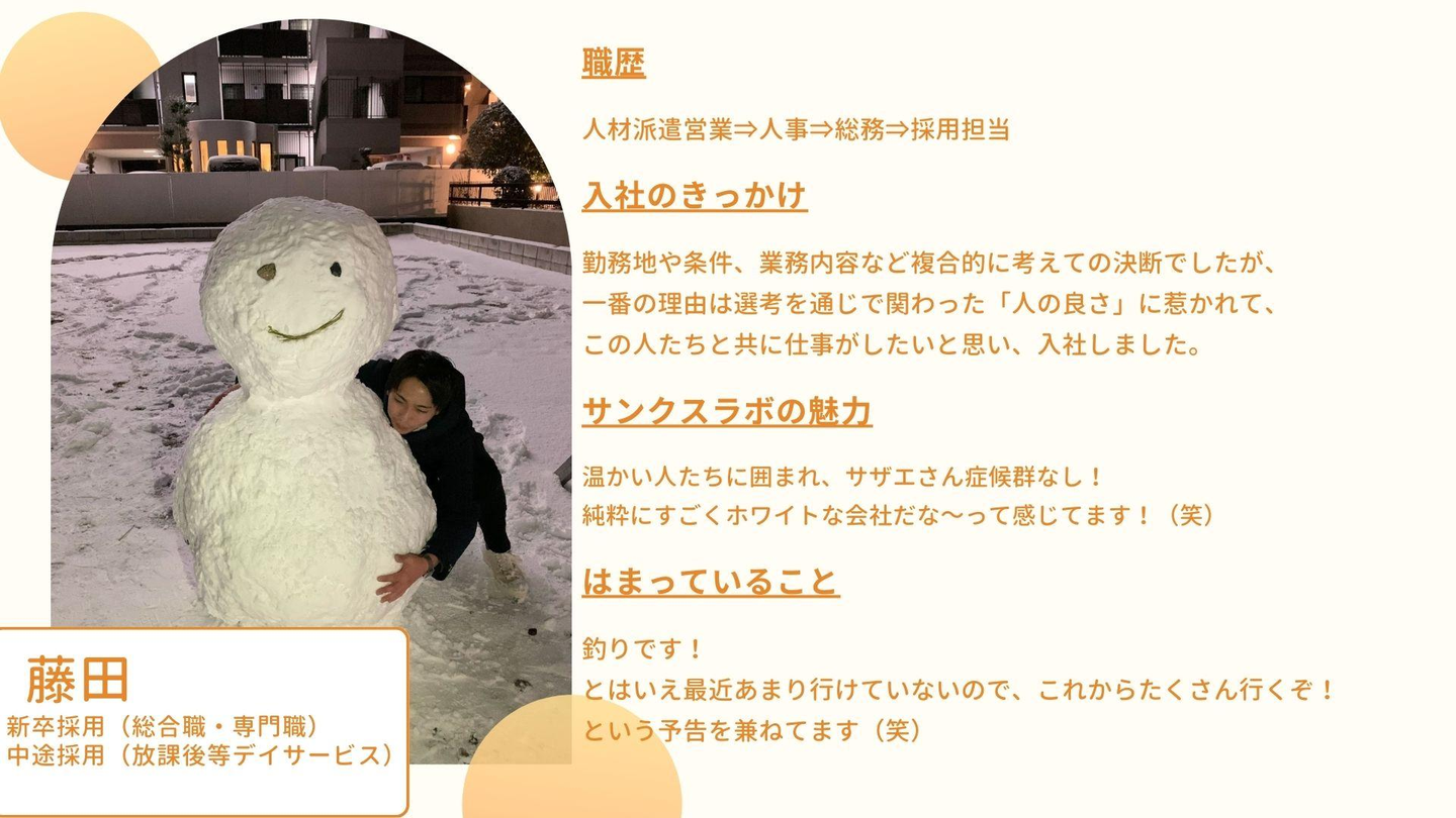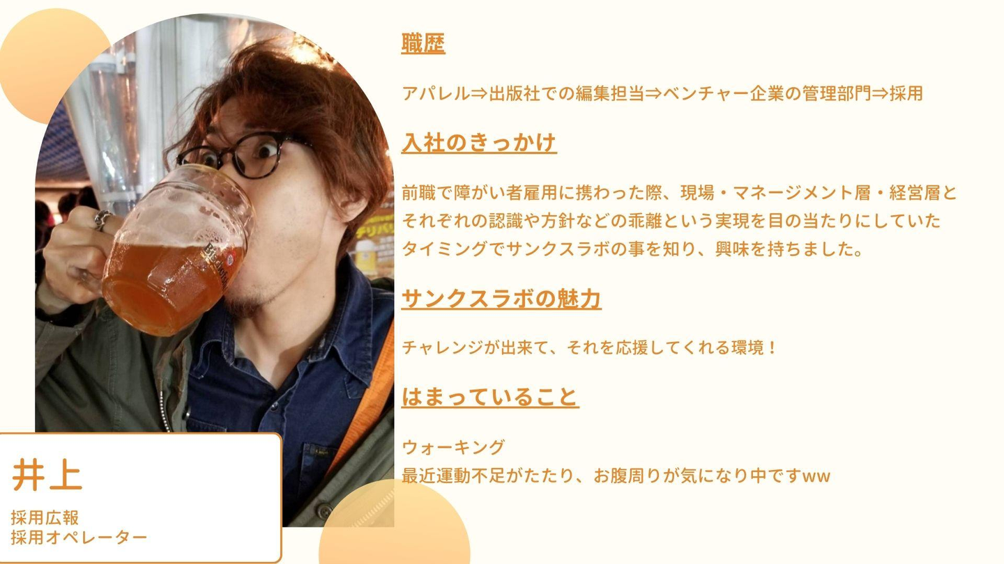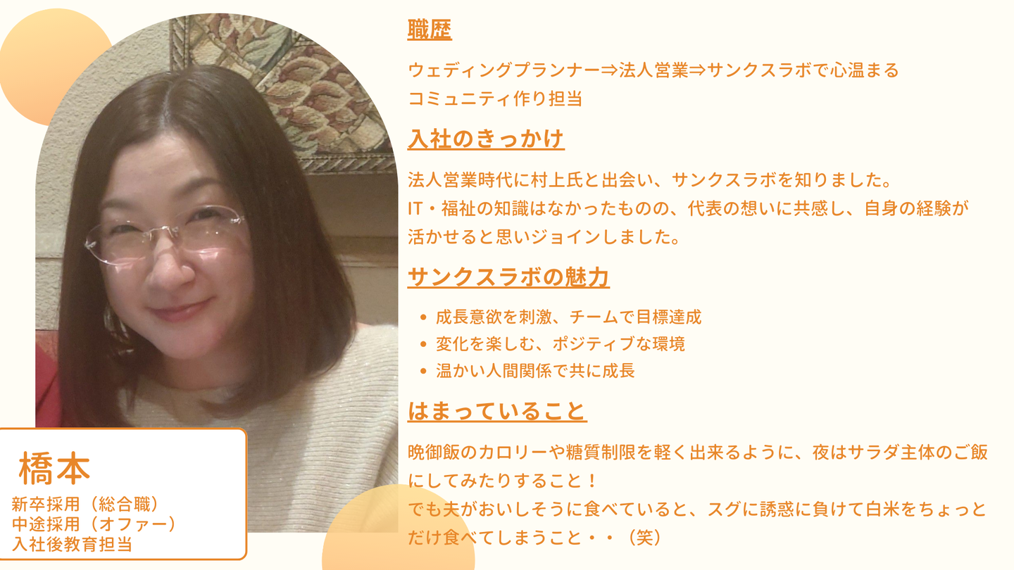 "サンクスラボは成長企業なので、多くのチャンスが待っています。自身の力を発揮する環境が整っておりますので、ぜひ一緒に会社を成長させましょう!”