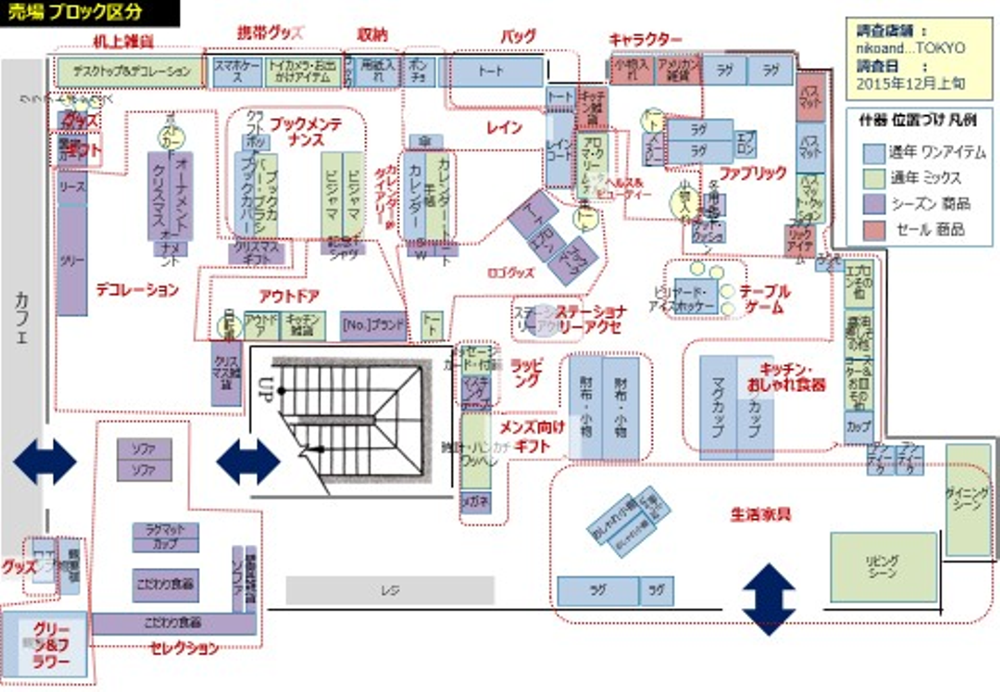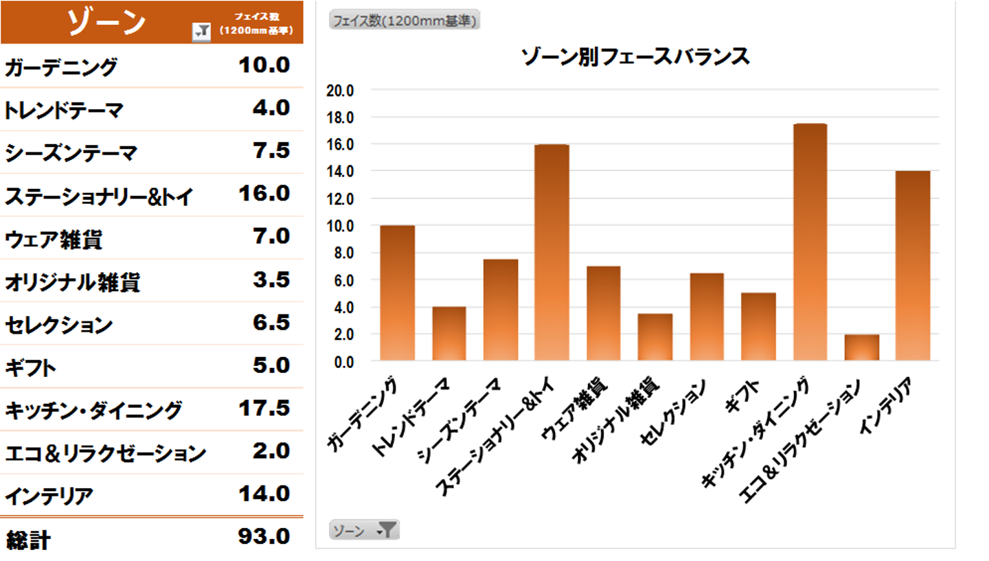 調査時期がクリスマスシーズンであったこともあり、フェースはシーズンデコレーションに多く占有されている。それ以外で高いシェアを持っているのは、「ブックメンテナンス」「ファブリック」「キッチン・おしゃれ食器」「バッグ」である。また、家具に大きな面積が割かれていることも注目だ。このMDを眺めて思うのは、旗艦店と稼ぎ頭であるSCテナント店との違いについてである。