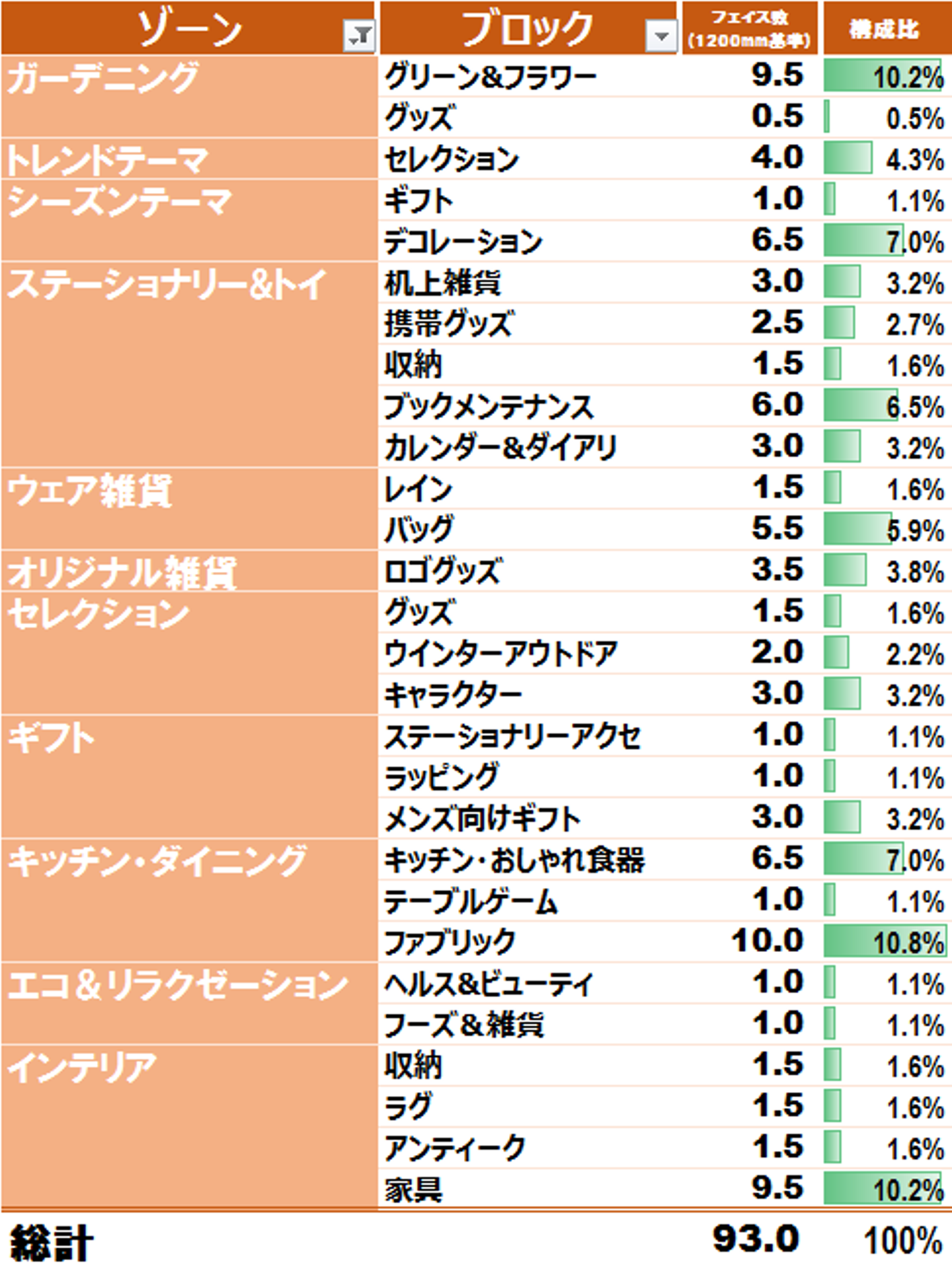 ゾーン別のフェイスバランスを見ると、「キッチンダイニング」と「ステーショナリー&トイ」が大きなウエイトを占めていることがわかる。意外だったのはエコ&リラクゼーションゾーンが思いのほか小さいことだ。女性ターゲットの生活雑貨業態ではこの辺やヘルスケア・カジュアルコスメが稼ぎ頭であるが、そこにはさほど力を入れていない。実際に店舗を見た印象で言うと、シーズンのイベント性に訴えるモノ、ファッションの次いで買いしたくなる携帯小物やステーショナリー(スマホアイテムも含めて)、そしてプライベートギフトアイテムが大部分を占めているということである。この辺はLOFT、フランフランなどの雑貨専業業態とはかなり異なるMD構成だ。さらに細かく売場編成を見たのが次の図である。
