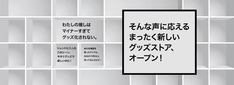 今までのグッズは、人気のある特定のキャラクターやポスターなどの決まった絵柄などが中心で、ファンの皆さまの様々なニーズに十分応えきれていませんでした。