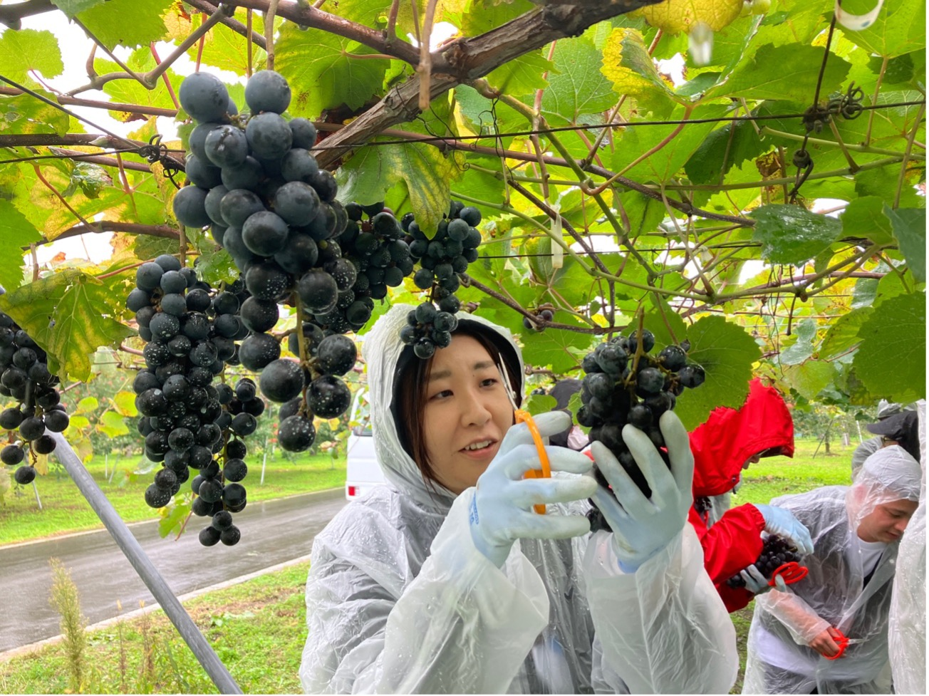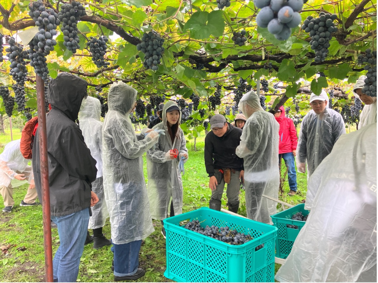 この日はあいにくの雨で、上手くできるのか不安もありましたが、まると花輪果樹園の花輪さまや、他の2農園の皆さま協力のもと、ぶどう収穫に真剣に向き合ってまいりました。