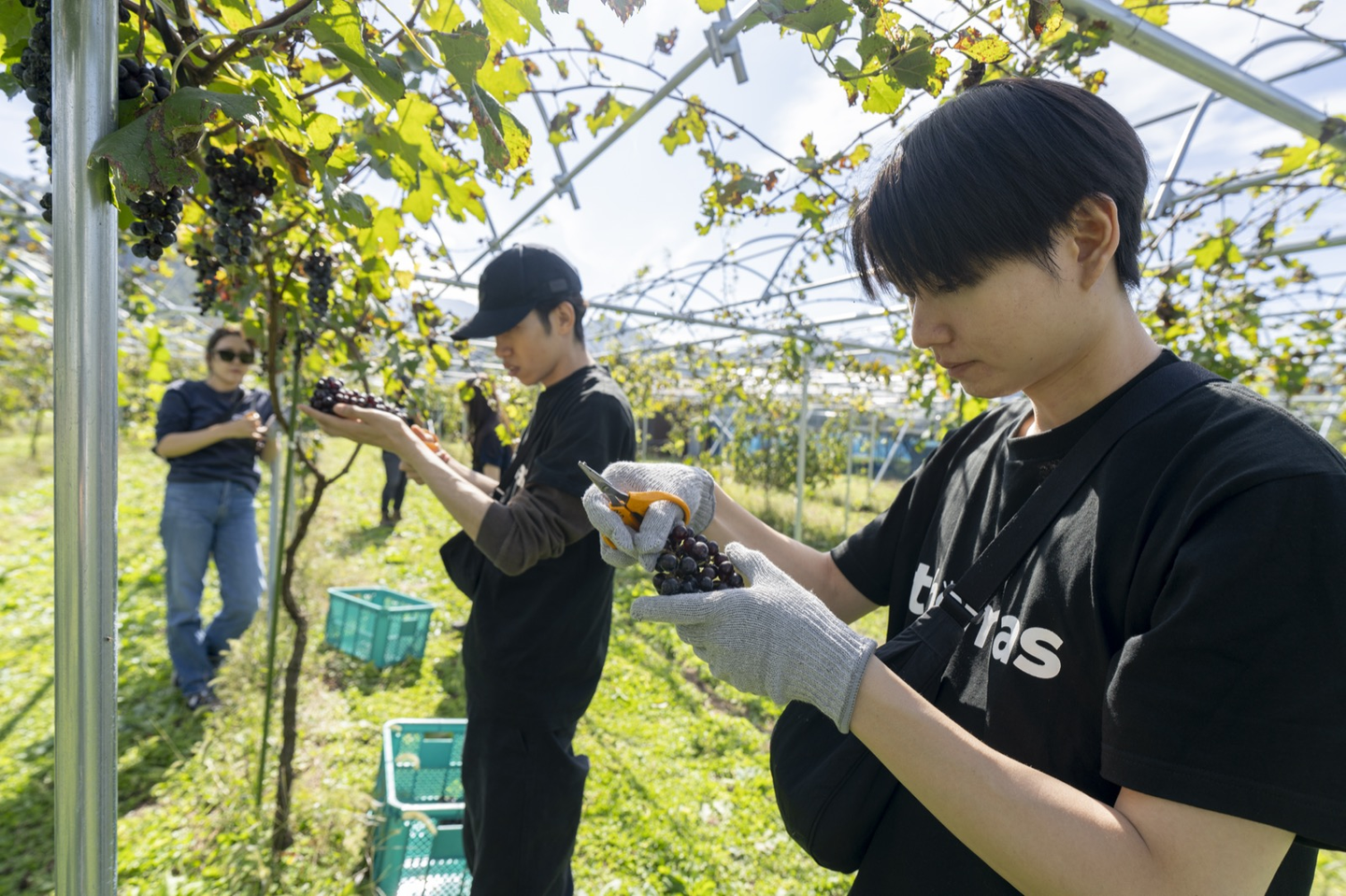 今回は、ワイン用ブドウのマスカットベーリーAのほか、海外品種のメルロー、カベルネ・ソーヴィニヨンも収穫させていただきました。