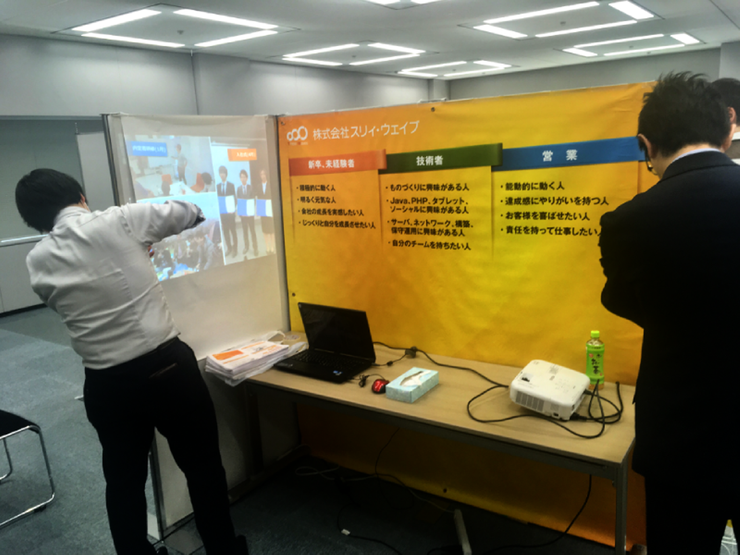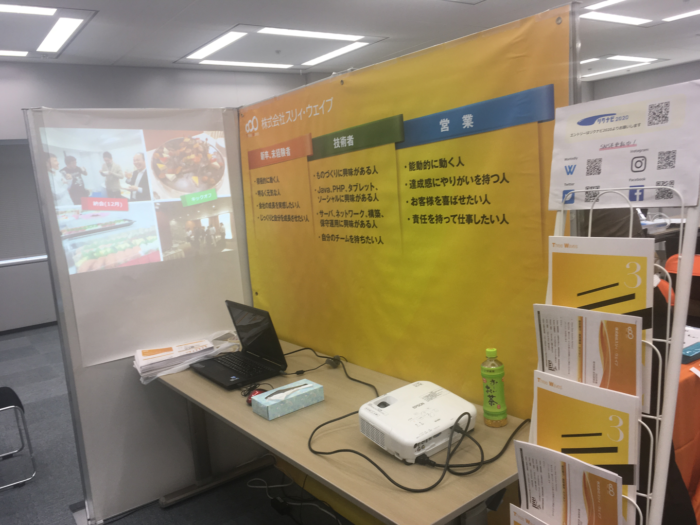 こんなに広い都会で、同じ目的で同じ場所に集まるなんてちょっと感動的だなーなんて思いつつ… 代表の湯田と髙杉含む管理部メンバー2名で開始前に頑張ってブースの準備。
