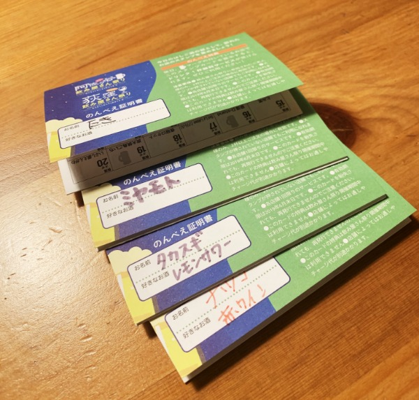 1軒目のお店に到着し、貰ったスタンプカードにはしっかり名前を書きます。のみスケですが、真面目なメンバー。さっとペンを出してくれるデキ男・宮本さんからお借りして、各々記入。